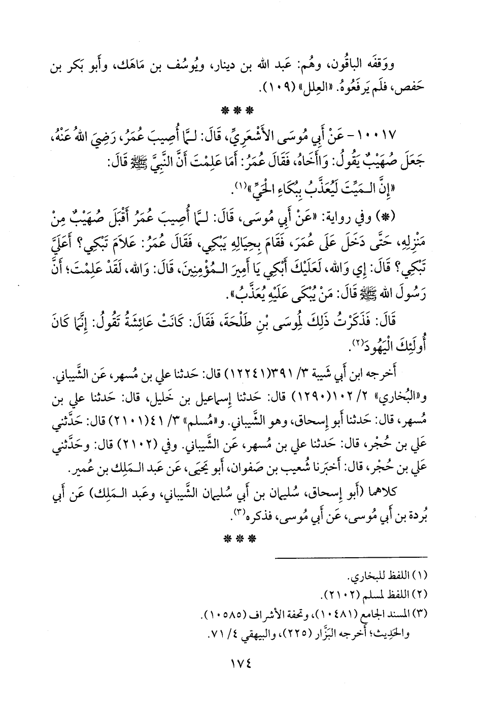 ١٠٠١٧ - عن أبي موسى الأشعري، قال: لما أصيب عمر، رضي الله عنه، جعل صهيب يقول: واأخاه، فقال عمر: أما علمت أن النبي صَلى الله عَليه وسَلم قال: