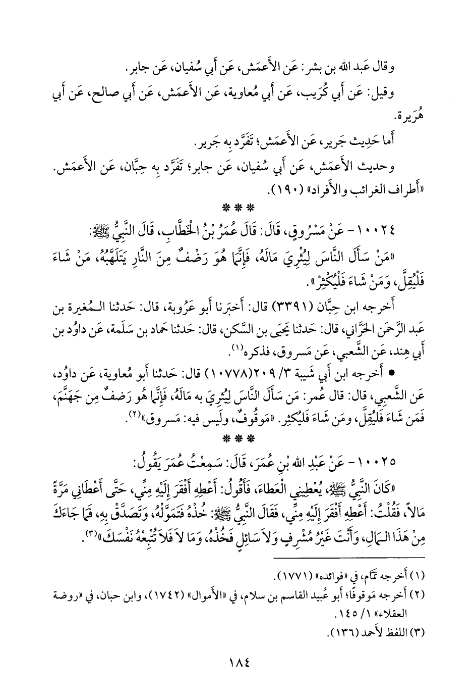 • أَخرجه ابن أبي شيبة (١٠٧٧٨) قال: حدثنا أَبو معاوية، عن داود، عن الشعبي، قال: قال عمر: من سأل الناس ليثري به ماله، فإنما هو رضف من جهنم, فمن شاء فليقل، ومن شاء فليكثر. «موقوف، وليس فيه: مسروق» (¬٢).