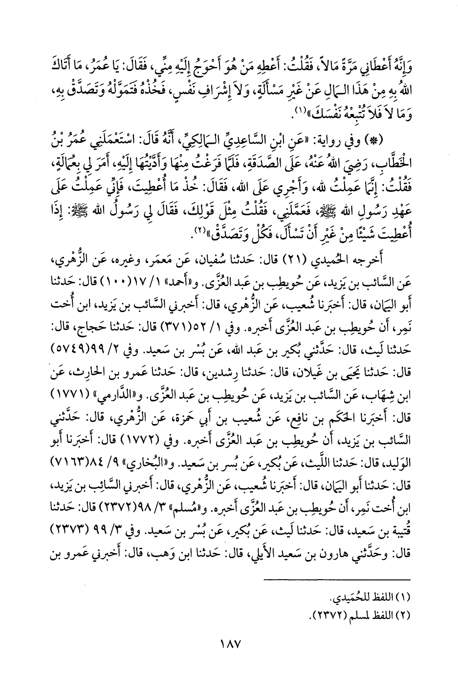 - وفي رواية: «عن ابن الساعدي المالكي، أنه قال: استعملني عمر بن الخطاب، رضي الله عنه، على الصدقة، فلما فرغت منها وأديتها إليه، أمر لي بعمالة، فقلت: إنما عملت لله، وأجري على الله، فقال: خذ ما أعطيت، فإني عملت على عهد رسول الله صَلى الله عَليه وسَلم فعملني، فقلت مثل قولك، فقال لي رسول الله صَلى الله عَليه وسَلم: إذا أعطيت شيئًا من غير أن تسأل، فكل وتصدق» (¬١).