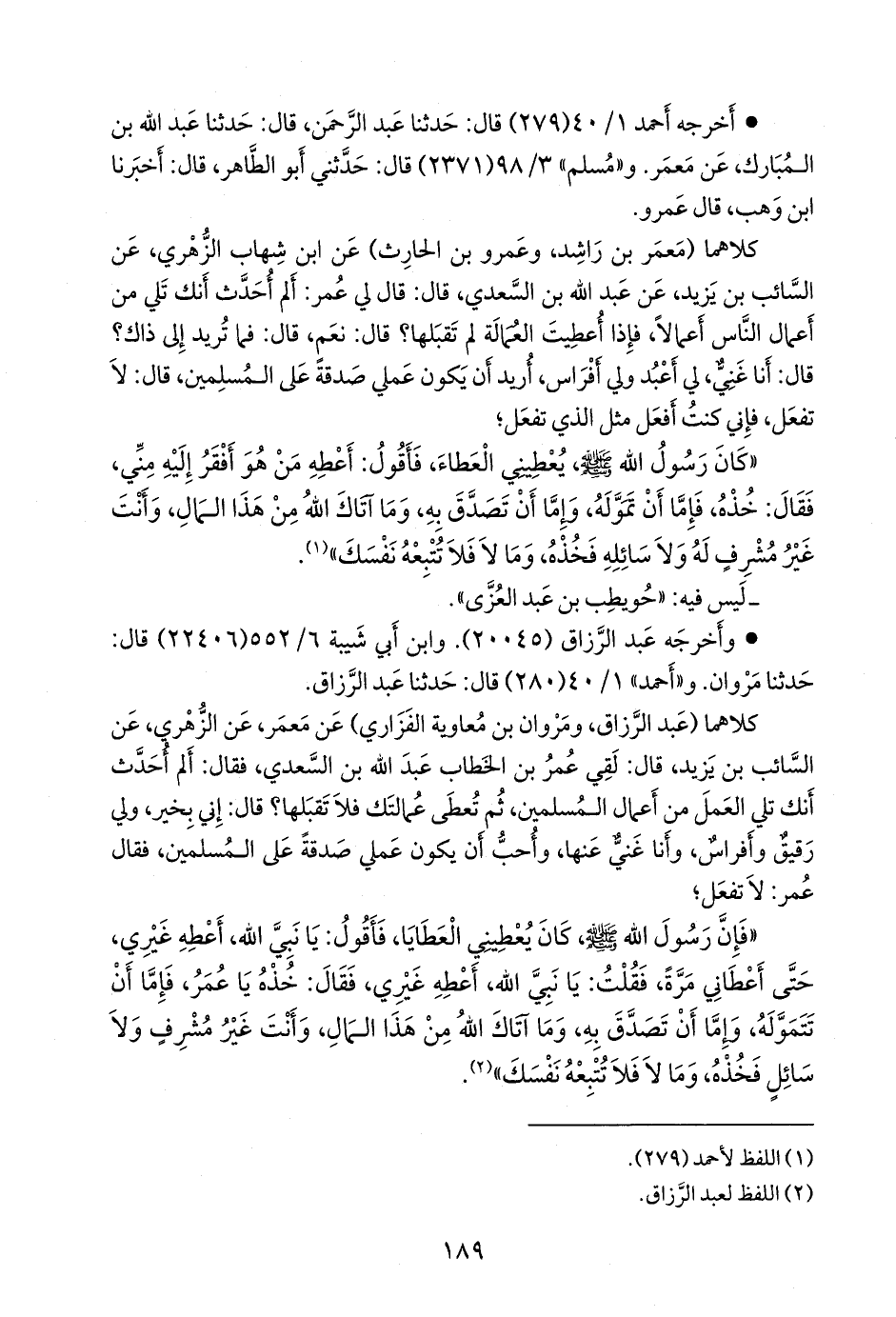 - وفي رواية: «عن السائب بن يزيد، قال: قال عمر: كان رسول الله صَلى الله عَليه وسَلم يعطيني العطاء، فأقول: يا رسول الله، أعطه من هو أحوج إليه مني، فقال رسول الله صَلى الله عَليه وسَلم: خذه، فإما أن تموله، وإما أن تصدق به، وما جاءك من هذا المال، وأنت غير سائل ولا مشرف فخذه، وما لا فلا تتبعه نفسك» (¬٢).