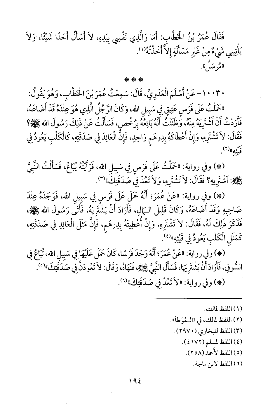 - وفي رواية: «حملت على فرس في سبيل الله، فرأيته يباع، فسألت النبي صَلى الله عَليه وسَلم: آشتريه؟ فقال: لا تشتره، ولا تعد في صدقتك» (¬٢).