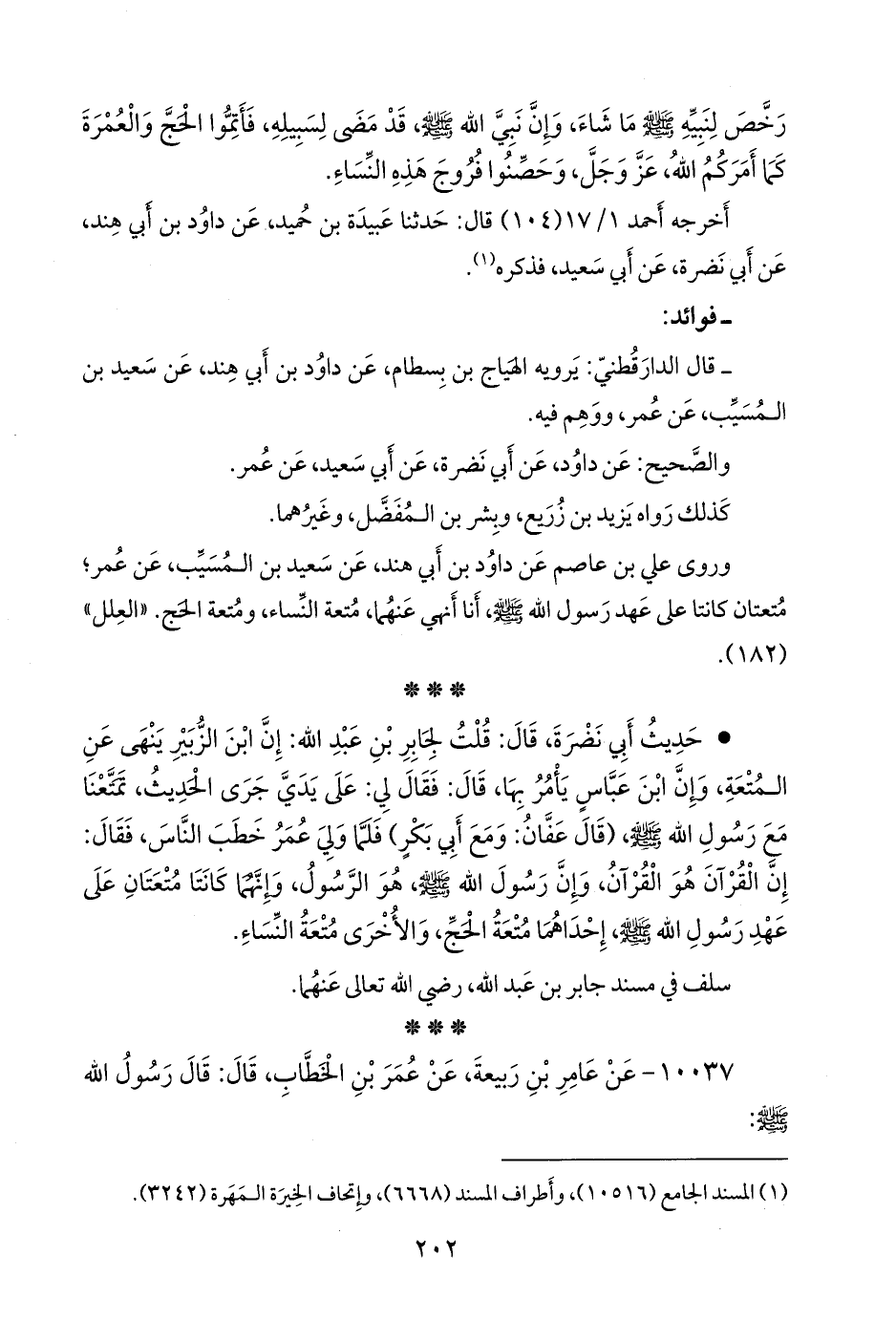 • حديث أبي نضرة، قال: قلت لجابر بن عبد الله: إن ابن الزبير ينهى عن المتعة، وإن ابن عباس يأمر بها، قال: فقال لي: على يدي جرى الحديث، تمتعنا مع رسول الله صَلى الله عَليه وسَلم (قال عفان: ومع أَبي بكر) فلما ولي عمر خطب الناس، فقال: إن القرآن هو القرآن، وإن رسول الله صَلى الله عَليه وسَلم هو الرسول، وإنهما كانتا متعتان على عهد رسول الله صَلى الله عَليه وسَلم إحداهما متعة الحج، والأخرى متعة النساء.