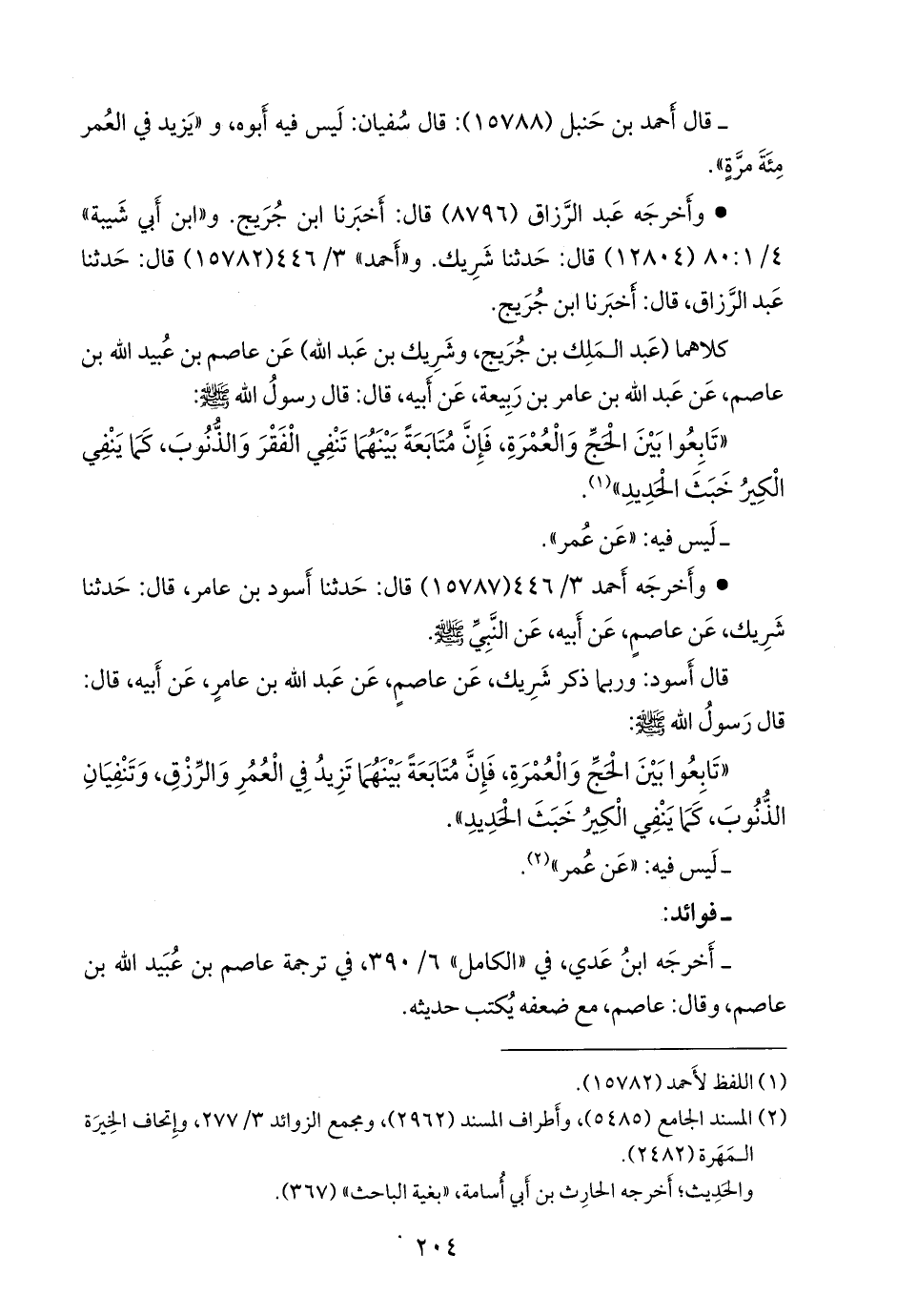 فأما رواية عُبيد الله بن عمر، عن عاصم، فرواه زهير، وابن نُمير، وعبدة بن سلمان، وأَبو حفص الأبار، وأَبو بدر، ومحمد بن بشر عن عُبيد الله، فاتفقوا على قول واحد، وأسندوه عن عبد الله بن عامر، عن أبيه، عن عمر.