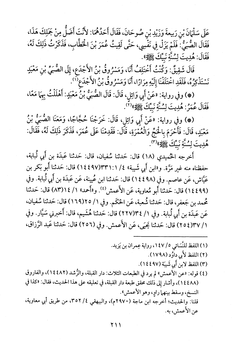 قال: أخبرنا سفيان، عن منصور. وفي ١/ ٥٣ (٣٧٩) قال: حدثنا عفان، قال: حدثنا شعبة، عن الحكم. و «ابن ماجة» (٢٩٧٠) قال: حدثنا أَبو بكر بن أبي شيبة، وهشام بن عمار، قالا: حدثنا سفيان بن عُيينة، عن عبدة بن أبي لبابة. وفي (٢٩٧٠ م) قال: حدثنا علي بن محمد، قال: حدثنا وكيع، وأَبو معاوية، وخالي يَعلى، قالوا: حدثنا الأعمش. و «أَبو داود» (١٧٩٨) قال: حدثنا عثمان بن أبي شيبة، قال: حدثنا جَرير بن عبد الحميد، عن منصور. وفي (١٧٩٩) قال: حدثنا محمد بن قُدَامة بن أَعْيَن، وعثمان بن أبي شيبة، المعنى, قالا: حدثنا جَرير بن عبد الحميد، عن منصور. و «النَّسَائي» ٥/ ١٤٦، وفي «الكبرى» (٣٦٨٥) قال: أخبرنا إسحاق بن إبراهيم، قال: أنبأنا جرير، عن منصور.