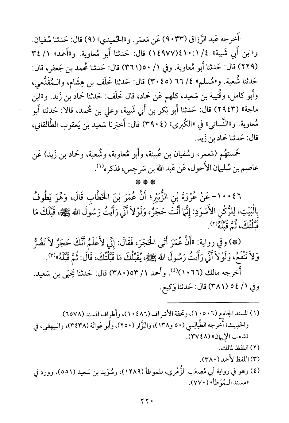 ١٠٠٤٦ - عن عروة بن الزبير؛ أن عمر بن الخطاب قال، وهو يطوف بالبيت، للركن الأسود: إنما أنت حجر، ولولا أني رأيت رسول الله صَلى الله عَليه وسَلم قبلك ما قبلتك، ثم قبله (¬١).