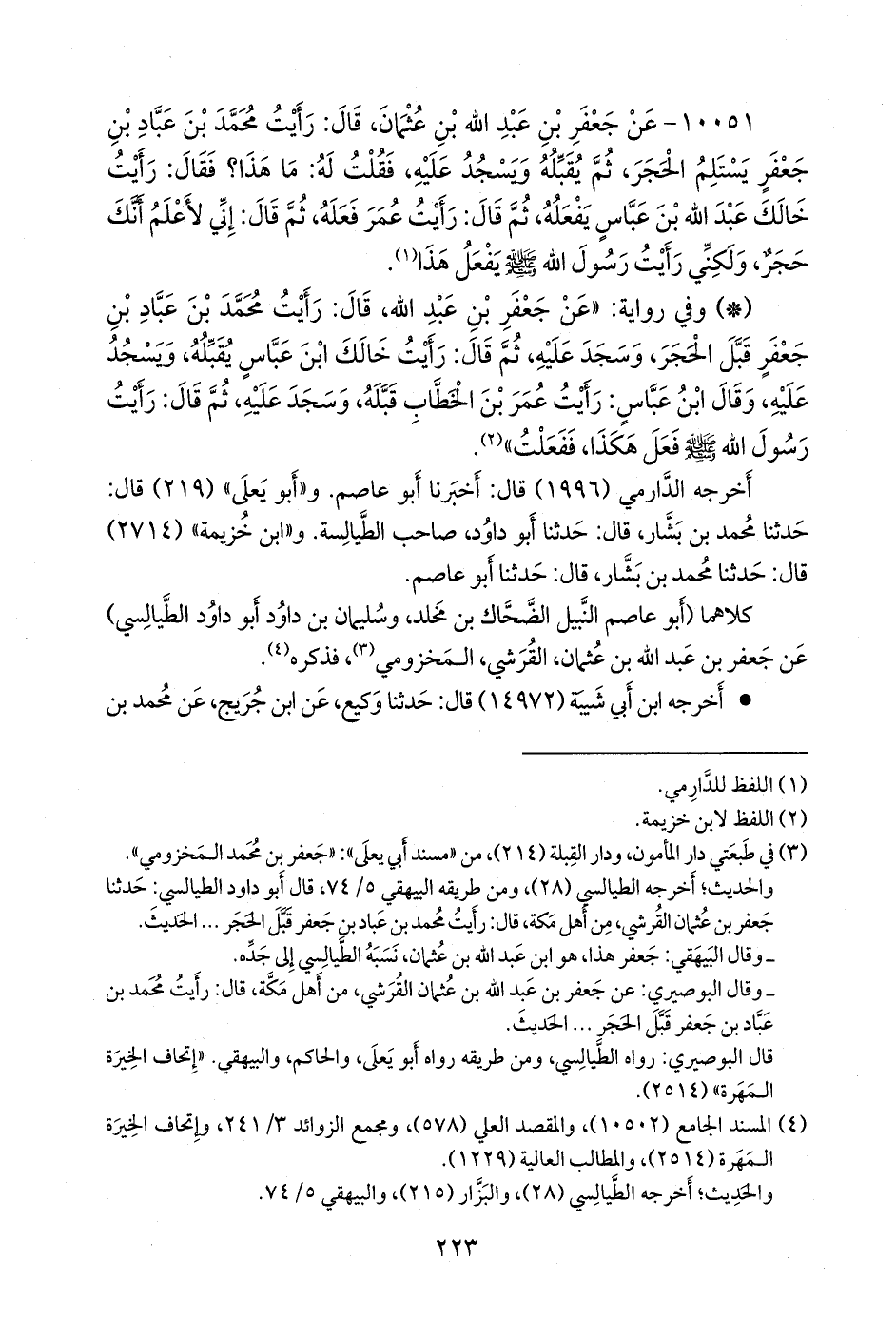 - وفي رواية: «عن جعفر بن عبد الله، قال: رأيت محمد بن عباد بن جعفر قبل الحجر، وسجد عليه، ثم قال: رأيت خالك ابن عباس يقبله، ويسجد عليه، وقال ابن عباس: رأيت عمر بن الخطاب قبله، وسجد عليه، ثم قال: رأيت رسول الله صَلى الله عَليه وسَلم فعل هكذا، ففعلت» (¬٢).