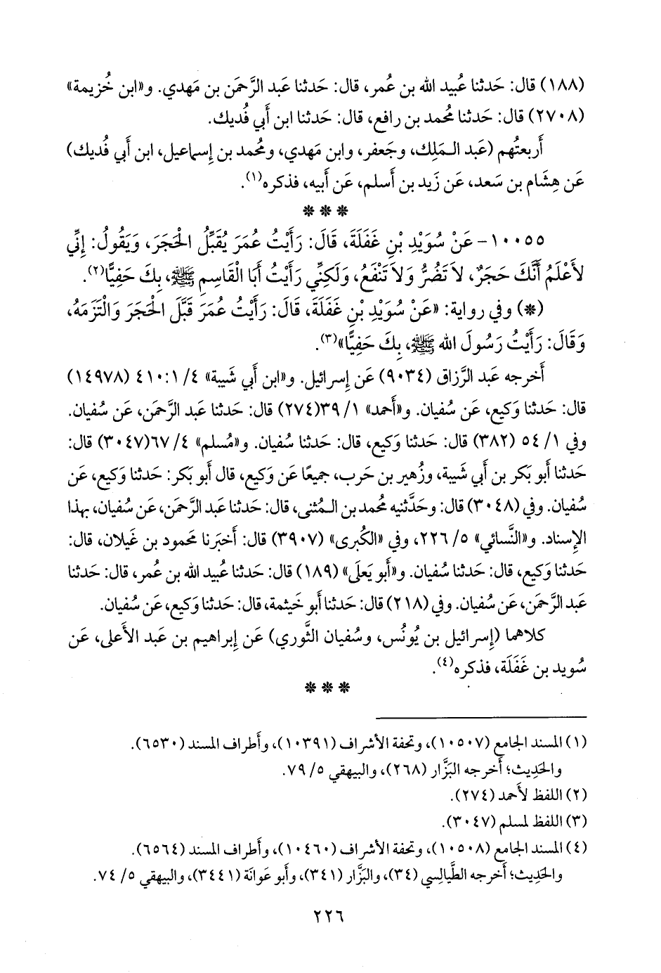 - وفي رواية: «عن سويد بن غفلة، قال: رأيت عمر قبل الحجر والتزمه، وقال: رأيت رسول الله صَلى الله عَليه وسَلم بك حفيا» (¬٢).