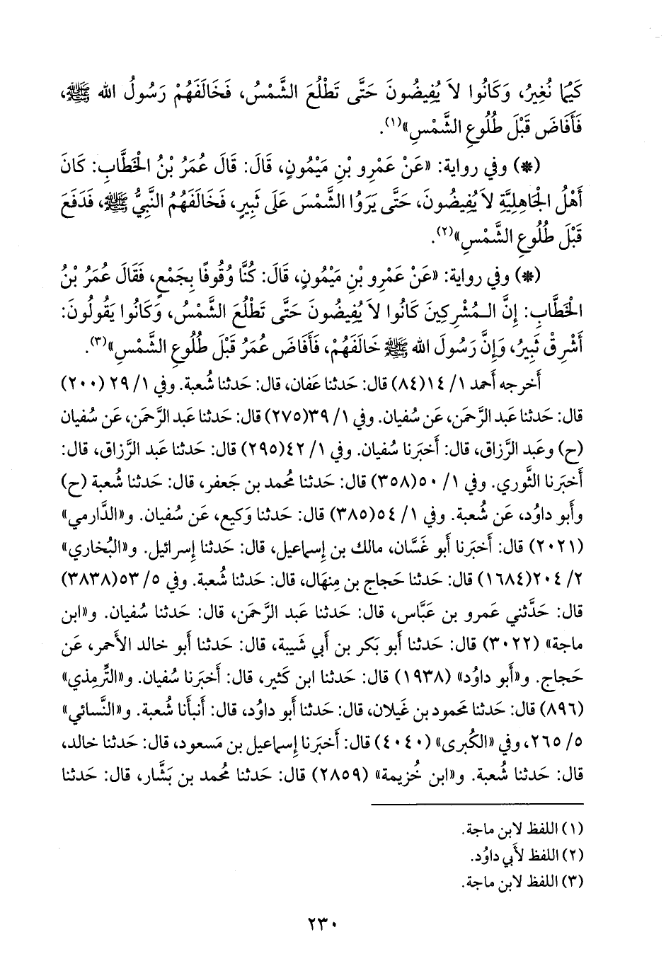 - وفي رواية: «عن عَمرو بن ميمون، قال: قال عمر بن الخطاب: كان أهل الجاهلية لا يفيضون، حتى يروا الشمس على ثبير، فخالفهم النبي صَلى الله عَليه وسَلم فدفع قبل طلوع الشمس» (¬١).