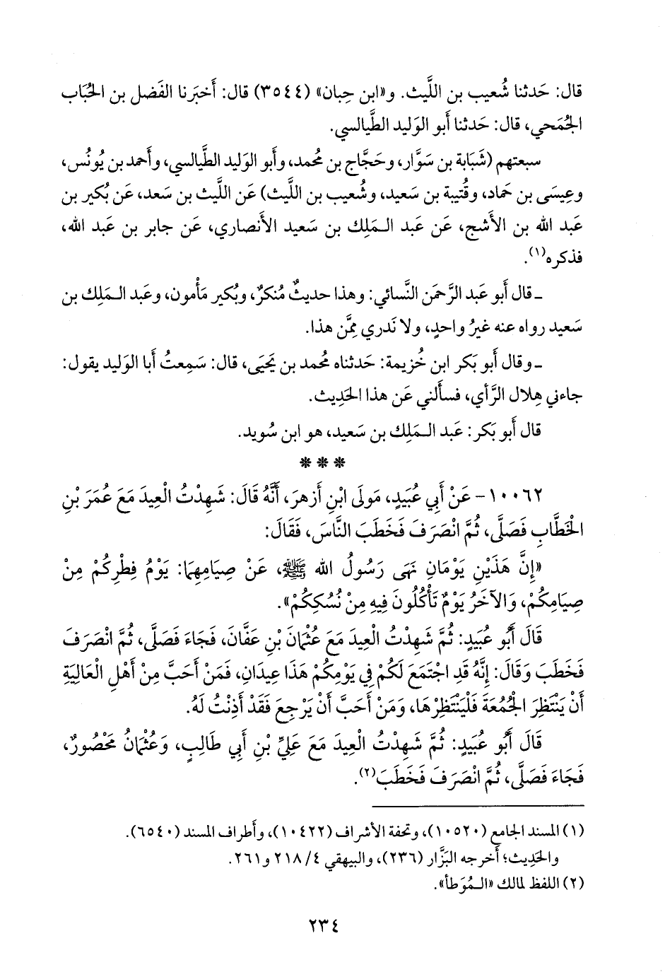١٠٠٦٢ - عن أبي عبيد مولى ابن أزهر، أنه قال: شهدت العيد مع عمر بن الخطاب فصلى، ثم انصرف فخطب الناس، فقال: