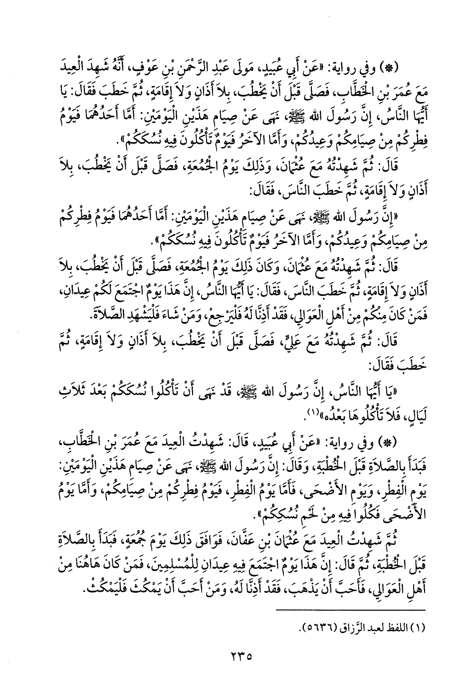 - وفي رواية: «عن أبي عبيد، قال: شهدت العيد مع عمر بن الخطاب، فبدأ بالصلاة قبل الخطبة، وقال: إن رسول الله صَلى الله عَليه وسَلم نهى عن صيام هذين اليومين: يوم الفطر، ويوم الأضحى، فأما يوم الفطر، فيوم فطركم من صيامكم، وأما يوم الأضحى فكلوا فيه من لحم نسككم».