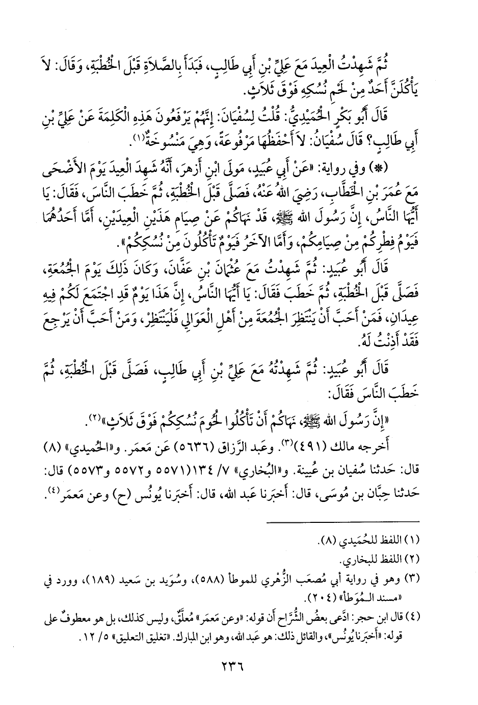 - وفي رواية: «عن أبي عبيد مولى ابن أزهر، أنه شهد العيد يوم الأضحى مع عمر بن الخطاب، رضي الله عنه، فصلى قبل الخطبة، ثم خطب الناس، فقال: يا أيها الناس، إن رسول الله صَلى الله عَليه وسَلم قد نهاكم عن صيام هذين العيدين، أما أحدهما فيوم فطركم من صيامكم، وأما الآخر فيوم تأكلون من نسككم».
