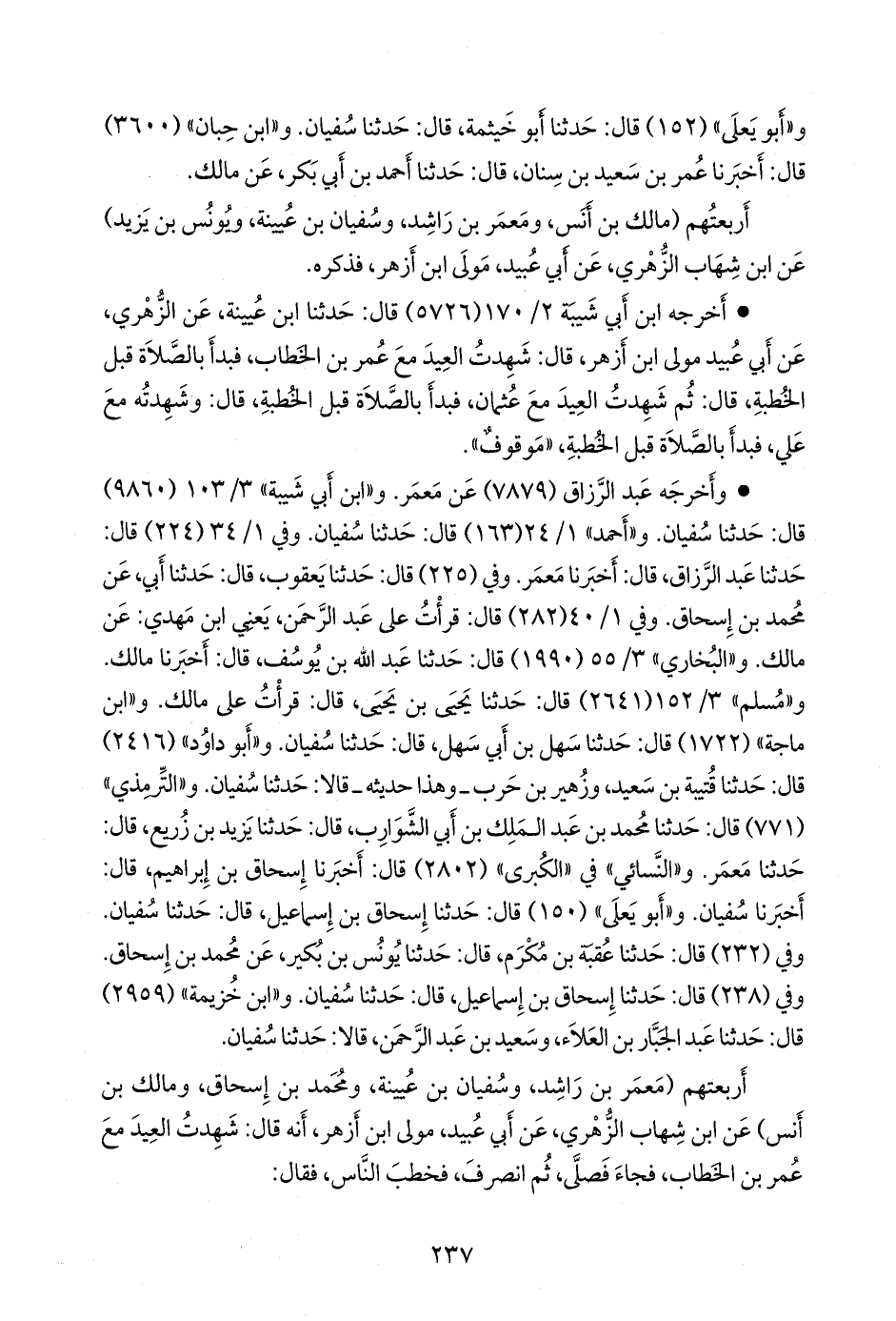 أربعتهم (مَعمَر بن راشد، وسفيان بن عُيينة، ومحمد بن إسحاق، ومالك بن أنس) عن ابن شهاب الزُّهْري، عن أبي عبيد مولى ابن أزهر، أنه قال: شهدت العيد مع عمر بن الخطاب، فجاء فصلى، ثم انصرف، فخطب الناس، فقال: