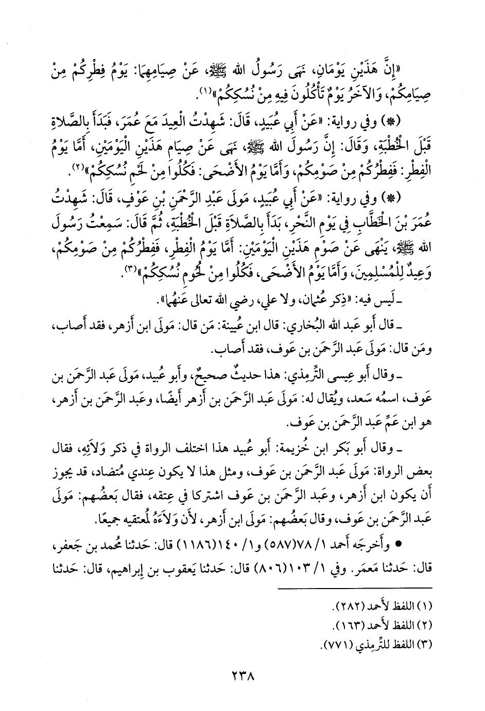 - وفي رواية: «عن أبي عبيد مولى عبد الرَّحمَن بن عوف، قال: ثم شهدته مع علي، فصلى قبل أن يخطب، بلا أذان ولا إقامة، ثم خطب، فقال: يا أيها الناس؛ إن رسول الله صَلى الله عَليه وسَلم قد نهى أن تأكلوا نسككم بعد ثلاث ليال، فلا تأكلوها بعد» (¬٣).