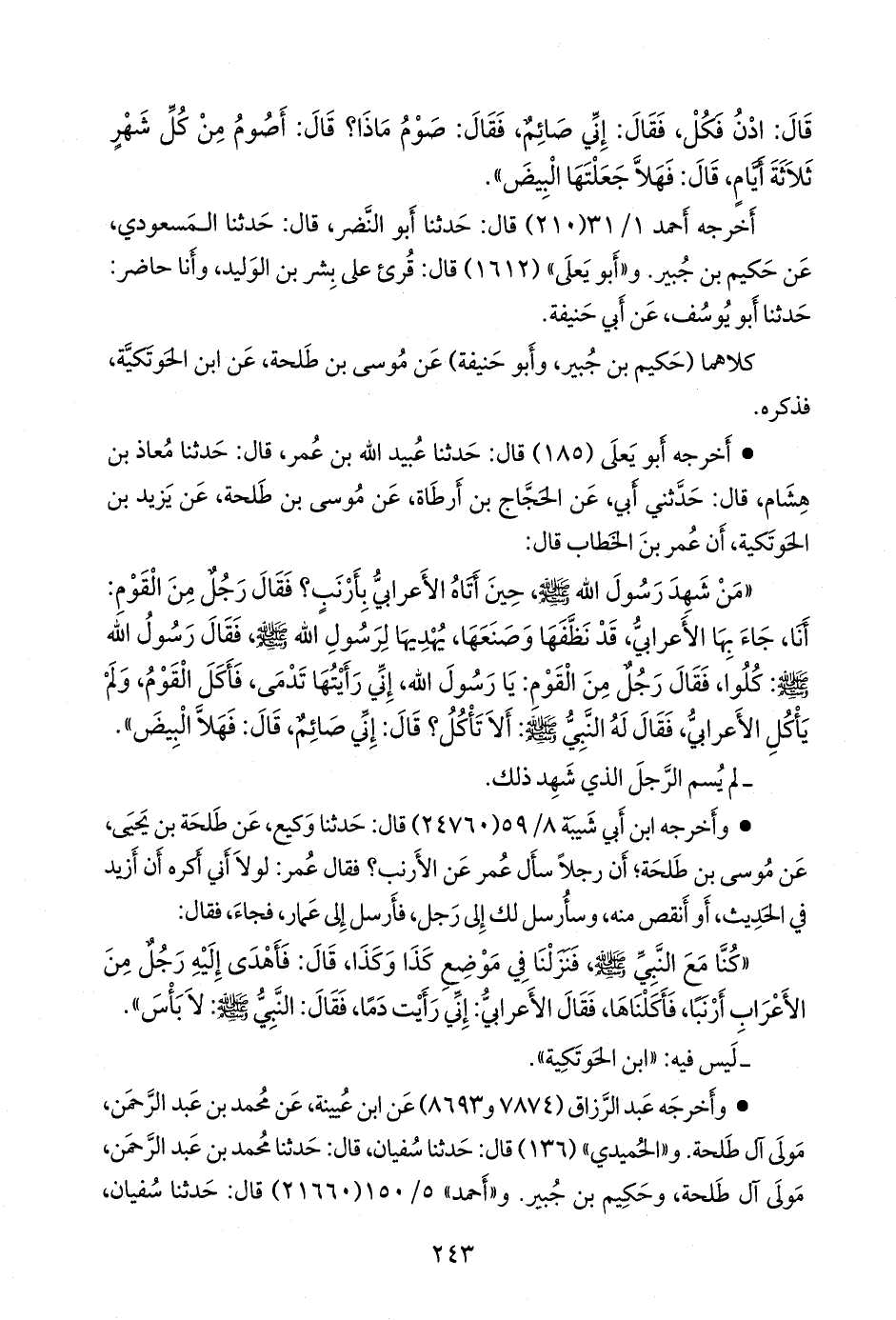 • وأخرجه ابن أبي شيبة (٢٤٧٦٠) قال: حدثنا وكيع، عن طلحة بن يحيى، عن موسى بن طلحة؛ أن رجلا سأل عمر عن الأرنب؟ فقال عمر: لولا أني أكره أن أزيد في الحديث، أو أنقص منه, وسأرسل لك إلى رجل, فأرسل إلى عمار، فجاء، فقال:
