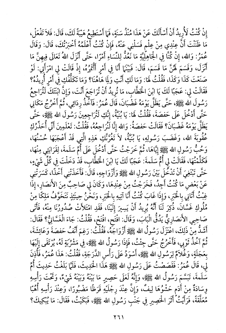فخرجت من عندها، وكان لي صاحب من الأنصار، إذا غبت أتاني بالخبر، وإذا غاب كنت أنا آتيه بالخبر، ونحن حينئذ نتخوف ملكا من ملوك غسان، ذكر لنا أنه يريد أن يسير إلينا، فقد امتلأت صدورنا منه، فأتى صاحبي الأَنصاري يدق الباب، وقال: افتح، افتح، فقلت: جاء الغساني؟ فقال: أشد من ذلك، اعتزل رسول الله صَلى الله عَليه وسَلم أزواجه، فقلت: رغم أنف حفصة وعائشة، ثم آخذ ثوبي، فأخرج حتى جئت، فإذا رسول الله صَلى الله عَليه وسَلم في مشربة له، يرتقى إليها بعجلة، وغلام لرسول الله صَلى الله عَليه وسَلم أسود على رأس الدرجة، فقلت: هذا عمر، فأذن لي، قال عمر: فقصصت على رسول الله صَلى الله عَليه وسَلم هذا الحديث، فلما بلغت حديث أُم سلمة، تبسم رسول الله صَلى الله عَليه وسَلم وإنه لعلى حصير ما بينه وبينه شيء، وتحت رأسه وسادة من أدم حشوها ليف، وإن عند رجليه قرظا مضبورا، وعند رأسه أهبا معلقة، فرأيت أثر الحصير في جنب رسول الله صَلى الله عَليه وسَلم فبكيت، فقال: ما يبكيك؟