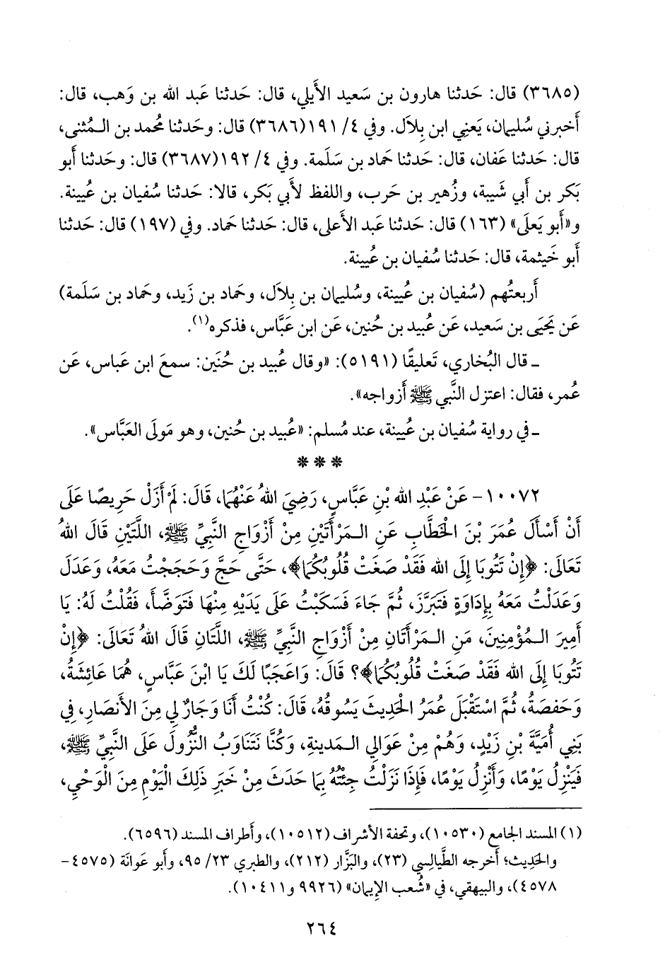 ١٠٠٧٢ - عن عبد الله بن عباس، رضي الله عنهما، قال: لم أزل حريصا على أن أسأل عمر بن الخطاب عن المرأتين من أزواج النبي صَلى الله عَليه وسَلم اللتين قال الله تعالى: {إن تتوبا إلى الله فقد صغت قلوبكما}، حتى حج وحججت معه، وعدل وعدلت معه بإداوة فتبرز، ثم جاء فسكبت على يديه منها فتوضأ، فقلت له: يا أمير المؤمنين، من المرأتان من أزواج النبي صَلى الله عَليه وسَلم اللتان قال الله تعالى: {إن تتوبا إلى الله فقد صغت قلوبكما}؟ قال: واعجبا لك يا ابن عباس، هما عائشة، وحفصة، ثم استقبل عمر الحديث يسوقه، قال: كنت أنا وجار لي من الأنصار، في بني أُمَية بن زيد، وهم من عوالي المدينة، وكنا نتناوب النزول على النبي صَلى الله عَليه وسَلم فينزل يوما، وأنزل يوما، فإذا نزلت جئته بما حدث من خبر ذلك اليوم من الوحي،