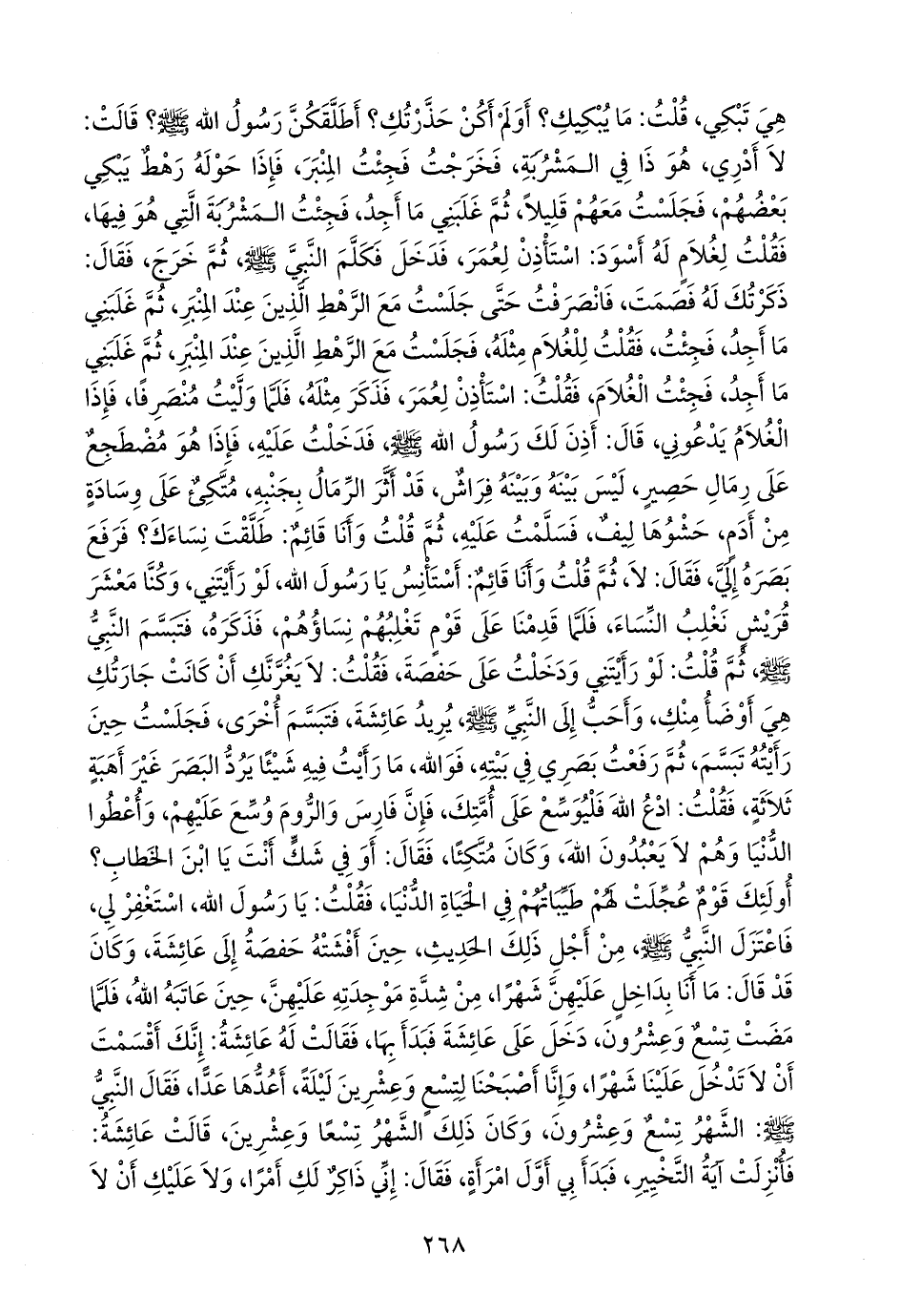 فلما وليت منصرفا، فإذا الغلام يدعوني، قال: أذن لك رسول الله صَلى الله عَليه وسَلم فدخلت عليه، فإذا هو مضطجع على رمال حصير، ليس بينه وبينه فراش، قد أثر الرمال بجنبه، متكئ على وسادة من أدم، حشوها ليف، فسلمت عليه، ثم قلت وأنا قائم: طلقت نساءك؟ فرفع بصره إلي، فقال: لا، ثم قلت وأنا قائم: أستأنس يا رسول الله، لو رأيتني، وكنا معشر قريش نغلب النساء، فلما قدمنا على قوم تغلبهم نساؤهم، فذكره، فتبسم النبي صَلى الله عَليه وسَلم ثم قلت: لو رأيتني ودخلت على حفصة، فقلت: لا يغرنك أن كانت جارتك هي أوضأ منك، وأحب إلى النبي صَلى الله عَليه وسَلم يريد عائشة، فتبسم أخرى، فجلست حين رأيته تبسم، ثم رفعت بصري في بيته، فوالله، ما رأيت فيه شيئًا يرد البصر غير أهبة ثلاثة، فقلت: ادع الله فليوسع على أمتك، فإن فارس والروم وسع عليهم، وأعطوا الدنيا وهم لا يعبدون الله، وكان متكئا، فقال: أو في شك أنت يا ابن الخطاب؟ أولئك قوم عجلت لهم طيباتهم في الحياة الدنيا، فقلت: يا رسول الله، استغفر لي، فاعتزل النبي صَلى الله عَليه وسَلم من أجل ذلك الحديث، حين أفشته حفصة إلى عائشة، وكان قد قال: ما أنا بداخل عليهن شهرا، من شدة موجدته عليهن، حين عاتبه الله، فلما مضت تسع وعشرون، دخل على عائشة فبدأ بها، فقالت له عائشة: إنك أقسمت أن لا تدخل علينا شهرا، وإنا أصبحنا لتسع وعشرين ليلة، أعدها عدا، فقال النبي صَلى الله عَليه وسَلم: الشهر تسع وعشرون، وكان ذلك الشهر تسعا وعشرين، قالت عائشة: فأنزلت آية التخيير، فبدأ بي أول امرأة، فقال: إني ذاكر لك أمرا، ولا عليك أن لا
