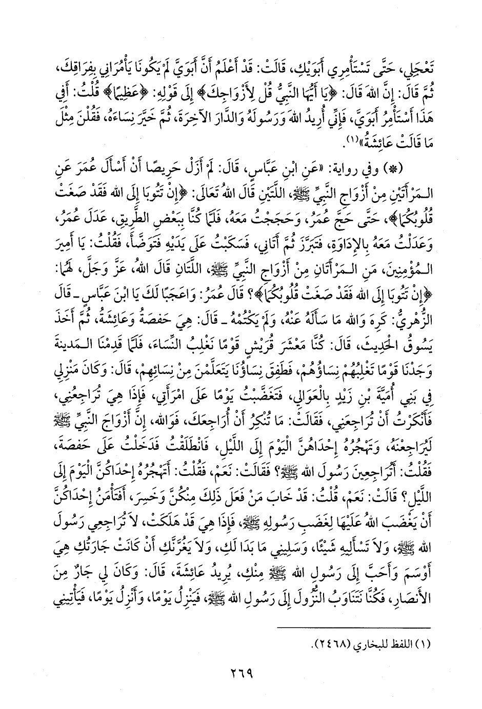 - وفي رواية: «عن ابن عباس، قال: لم أزل حريصا أن أسأل عمر عن المرأتين من أزواج النبي صَلى الله عَليه وسَلم اللتين قال الله تعالى: {إن تتوبا إلى الله فقد صغت قلوبكما}، حتى حج عمر، وحججت معه، فلما كنا ببعض الطريق، عدل عمر، وعدلت معه بالإداوة، فتبرز ثم أتاني، فسكبت على يديه فتوضأ، فقلت: يا أمير المؤمنين، من المرأتان من أزواج النبي صَلى الله عَليه وسَلم اللتان قال الله، عز وجل، لهما: {إن تتوبا إلى الله فقد صغت قلوبكما}؟ قال عمر: واعجبا لك يا ابن عباس ـ قال الزُّهْري: كره والله ما سأله عنه، ولم يكتمه ـ قال: هي حفصة وعائشة، ثم أخذ يسوق الحديث، قال: كنا معشر قريش قوما نغلب النساء، فلما قدمنا المدينة وجدنا قوما تغلبهم نساؤهم، فطفق نساؤنا يتعلمن من نسائهم، قال: وكان منزلي في بني أُمَية بن زيد بالعوالي، فتغضبت يوما على امرأتي، فإذا هي تراجعني، فأنكرت أن تراجعني، فقالت: ما تنكر أن أراجعك، فوالله، إن أزواج النبي صَلى الله عَليه وسَلم ليراجعنه، وتهجره إحداهن اليوم إلى الليل، فانطلقت فدخلت على حفصة، فقلت: أتراجعين رسول الله صَلى الله عَليه وسَلم؟ فقالت: نعم، فقلت: أتهجره إحداكن اليوم إلى الليل؟ قالت: نعم، قلت: قد خاب من فعل ذلك منكن وخسر، أفتأمن إحداكن أن يغضب الله عليها لغضب رسوله صَلى الله عَليه وسَلم فإذا هي قد هلكت، لا تراجعي رسول الله صَلى الله عَليه وسَلم ولا تسأليه شيئا، وسليني ما بدا لك، ولا يغرنك أن كانت جارتك هي أوسم وأحب إلى رسول الله صَلى الله عَليه وسَلم منك، يريد عائشة، قال: وكان لي جار من الأنصار، فكنا نتناوب النزول إلى رسول الله صَلى الله عَليه وسَلم فينزل يوما، وأنزل يوما، فيأتيني