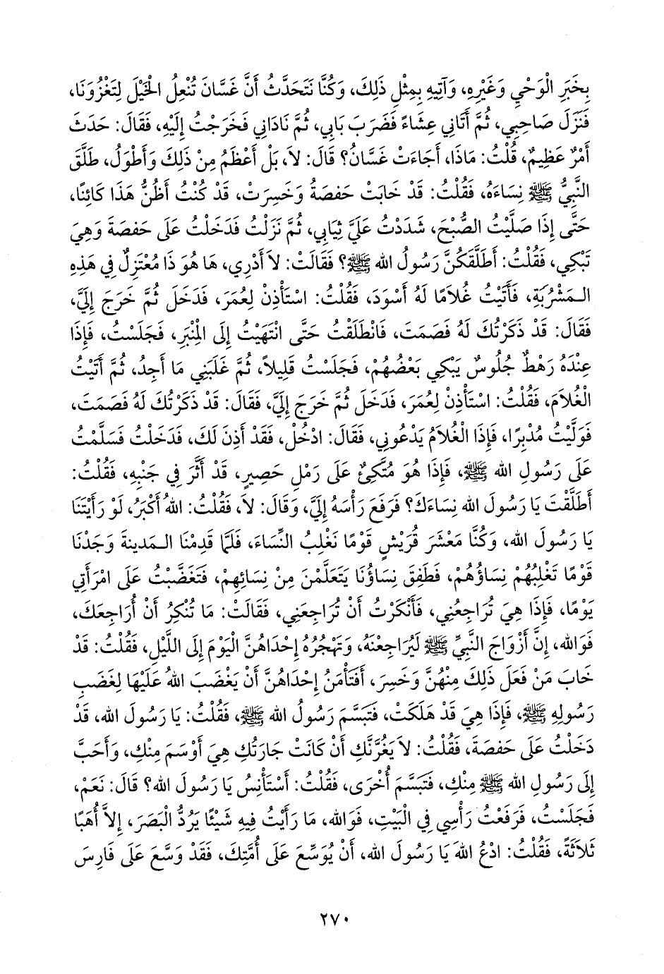 ثم نزلت فدخلت على حفصة وهي تبكي، فقلت: أطلقكن رسول الله صَلى الله عَليه وسَلم؟ فقالت: لا أدري، ها هو ذا معتزل في هذه المشربة، فأتيت غلاما له أسود، فقلت: استأذن لعمر، فدخل ثم خرج إلي، فقال: قد ذكرتك له فصمت، فانطلقت حتى انتهيت إلى المنبر، فجلست، فإذا عنده رهط جلوس يبكي بعضهم، فجلست قليلا، ثم غلبني ما أجد، ثم أتيت الغلام، فقلت: استأذن لعمر، فدخل ثم خرج إلي، فقال: قد ذكرتك له فصمت، فوليت مدبرا، فإذا الغلام يدعوني، فقال: ادخل، فقد أذن لك، فدخلت فسلمت على رسول الله صَلى الله عَليه وسَلم فإذا هو متكئ على رمل حصير، قد أثر في جنبه، فقلت: أطلقت يا رسول الله نساءك؟ فرفع رأسه إلي، وقال: لا، فقلت: الله أكبر، لو رأيتنا يا رسول الله، وكنا معشر قريش قوما نغلب النساء، فلما قدمنا المدينة وجدنا قوما تغلبهم نساؤهم، فطفق نساؤنا يتعلمن من نسائهم، فتغضبت على امرأتي يوما، فإذا هي تراجعني، فأنكرت أن تراجعني، فقالت: ما تنكر أن أراجعك، فوالله، إن أزواج النبي صَلى الله عَليه وسَلم ليراجعنه، وتهجره إحداهن اليوم إلى الليل، فقلت: قد خاب من فعل ذلك منهن وخسر، أفتأمن إحداهن أن يغضب الله عليها لغضب رسوله صَلى الله عَليه وسَلم فإذا هي قد هلكت، فتبسم رسول الله صَلى الله عَليه وسَلم فقلت: يا رسول الله، قد دخلت على حفصة، فقلت: لا يغرنك أن كانت جارتك هي أوسم منك، وأحب إلى رسول الله صَلى الله عَليه وسَلم منك، فتبسم أخرى، فقلت: أستأنس يا رسول الله؟ قال: نعم، فجلست، فرفعت رأسي في البيت، فوالله، ما رأيت فيه شيئًا يرد البصر، إلا أهبا ثلاثة، فقلت: ادع الله يا رسول الله، أن يوسع على أمتك، فقد وسع على فارس