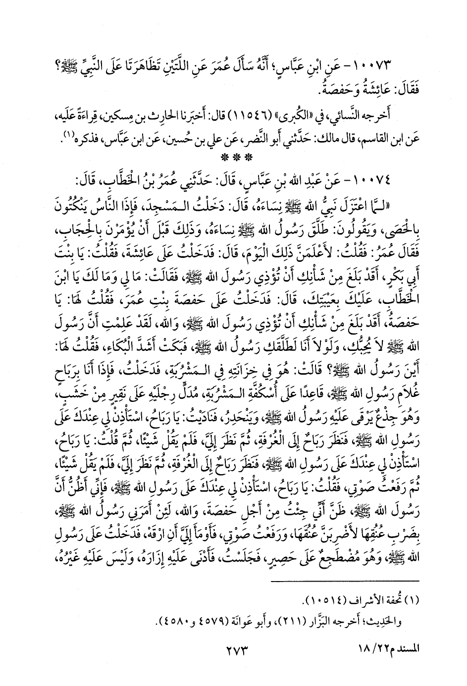 ١٠٠٧٣ - عن ابن عباس؛ أنه سأل عمر عن اللتين تظاهرتا على النبي صَلى الله عَليه وسَلم؟ فقال: عائشة وحفصة.