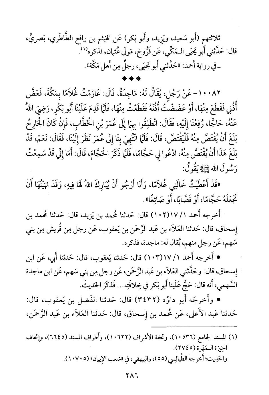 ١٠٠٨٢ - عن رجل، يقال له: ماجدة، قال: عارمت غلاما بمكة، فعض أذني فقطع منها، أو عضضت أذنه فقطعت منها، فلما قدم علينا أَبو بكر، رضي الله عنه، حاجا، رفعنا إليه، فقال: انطلقوا بهما إلى عمر بن الخطاب، فإن كان الجارح بلغ أن يقتص منه فليقتص، قال: فلما انتهي بنا إلى عمر نظر إلينا، فقال: نعم، قد بلغ هذا أن يقتص منه، ادعوا لي حجاما، فلما ذكر الحجام، قال: أما إني قد سمعت رسول الله صَلى الله عَليه وسَلم يقول: