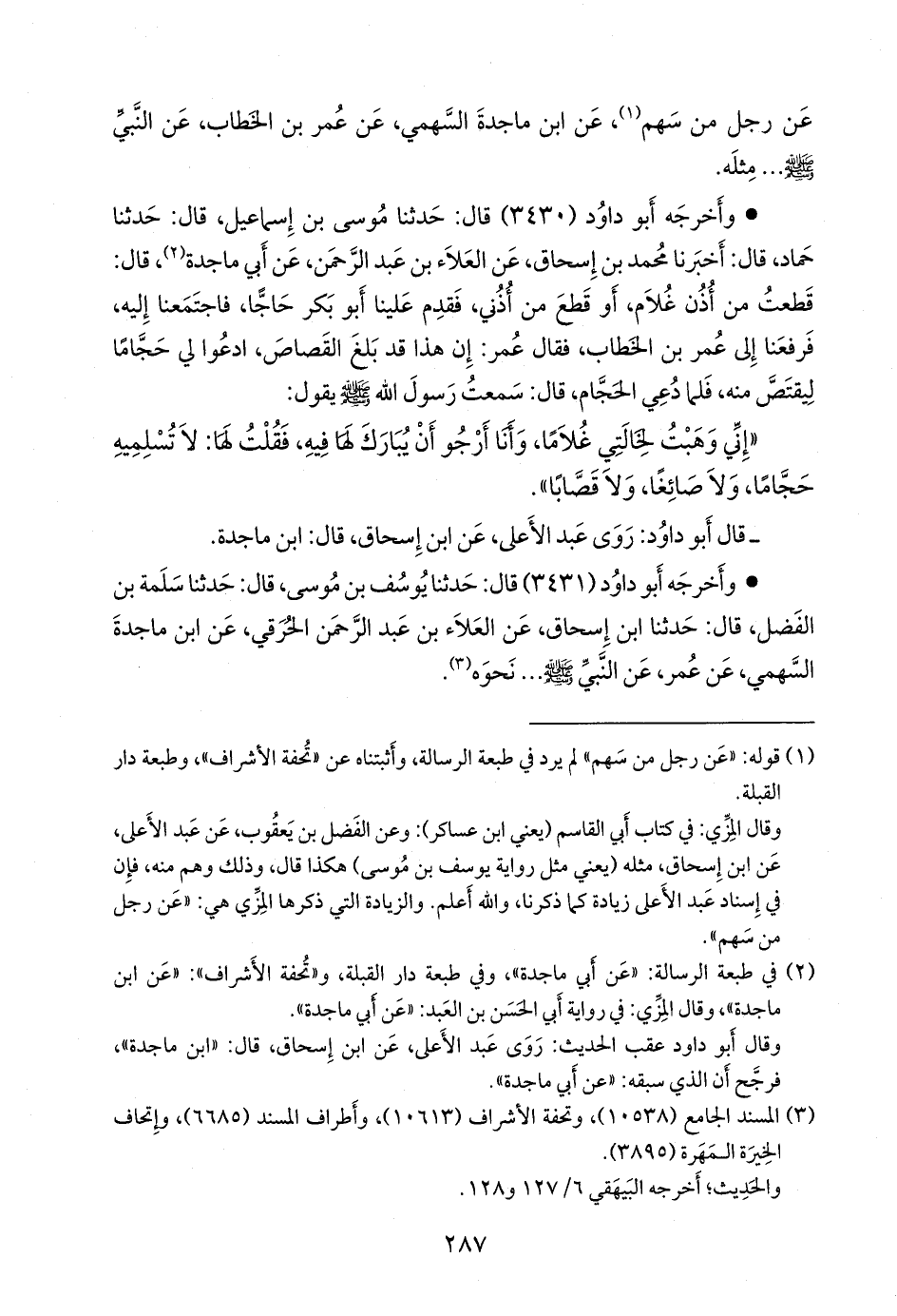 • وأخرجه أَبو داود (٣٤٣١) قال: حدثنا يوسف بن موسى، قال: حدثنا سلمة بن الفضل، قال: حدثنا ابن إسحاق، عن العلاء بن عبد الرَّحمَن الحُرَقِي، عن ابن ماجدة السهمي، عن عمر، عن النبي صَلى الله عَليه وسَلم، نَحوَه (¬٢).