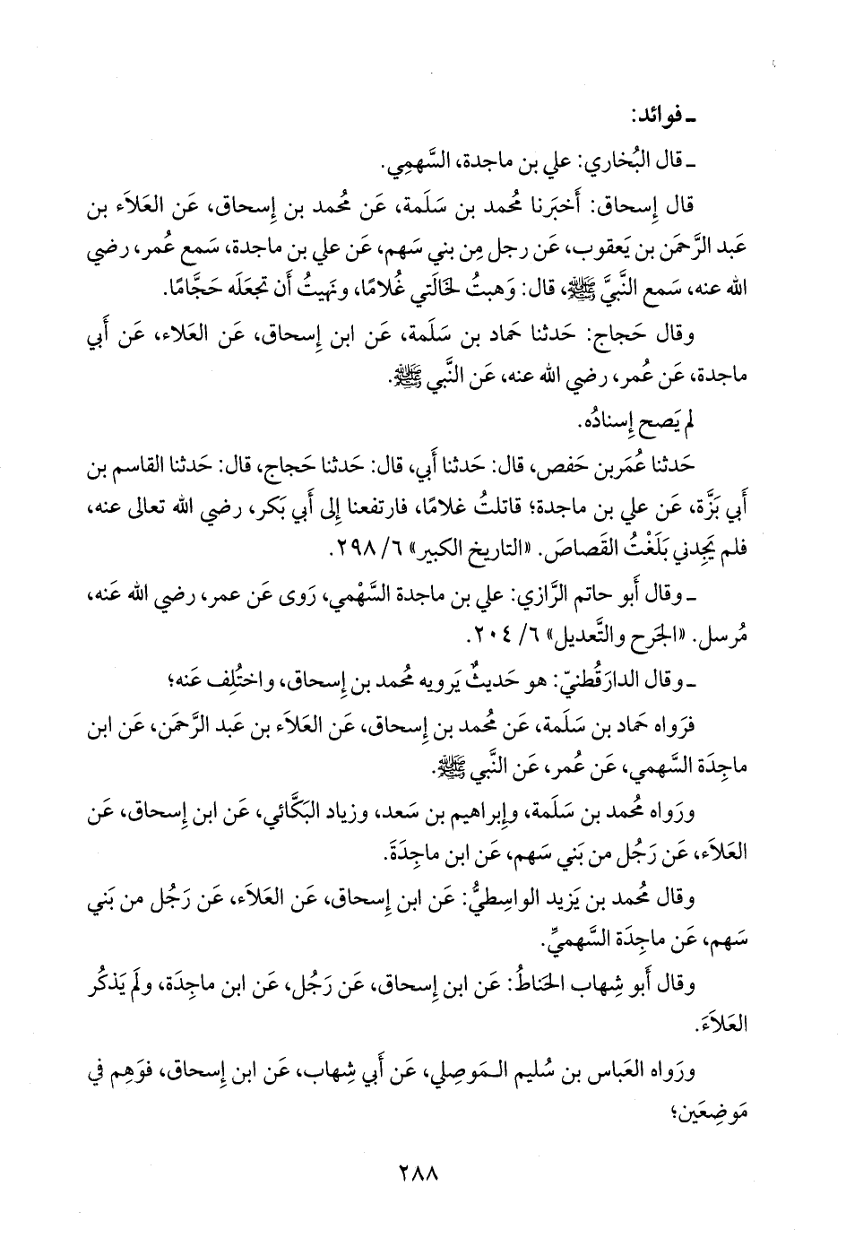 ورواه محمد بن سلمة، وإبراهيم بن سعد، وزياد البكائي، عن ابن إسحاق، عن العلاء، عن رجل من بني سهم، عن ابن ماجدة.