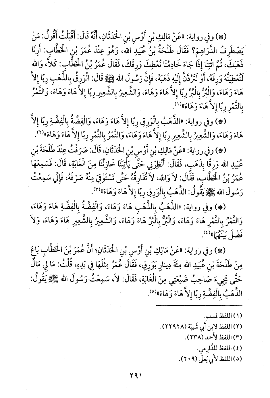 - وفي رواية: «عن مالك بن أوس بن الحدثان، قال: انطلقت بمئة دينار، فلقيت طلحة بن عُبيد الله بظل جدار، فاستامها مني إلى أن يأتيه خادمه من الغابة، فسمع ذلك عمر، فسأل طلحة عنه؟ فقال: دنانير أردتها إلى أن يأتي خادمي من الغابة، فقال عمر: لا تفارقه، لا تفارقه حتى تنقده، قال رسول الله صَلى الله عَليه وسَلم: الذهب بالورق ربا إلا هاء وهات، والبر بالبر ربا إلا هاء وهات، والشعير بالشعير ربا إلا هاء وهات، والتمر بالتمر ربا إلا هاء وهات» (¬٣).