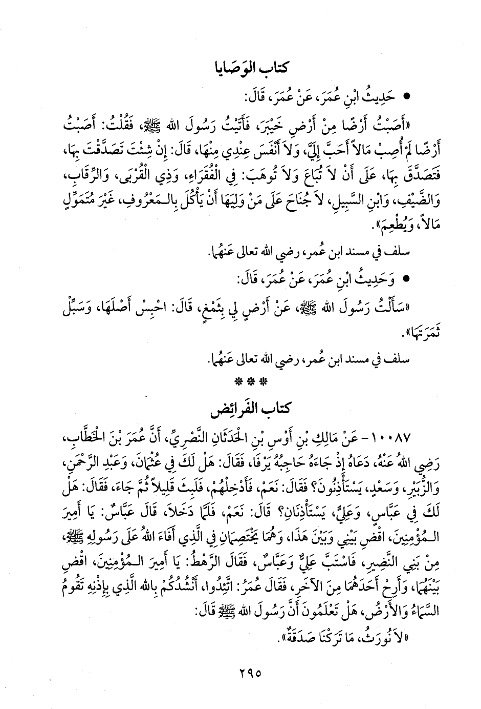 «أصبت أرضا من أرض خيبر، فأتيت رسول الله صَلى الله عَليه وسَلم فقلت: أصبت أرضا لم أصب مالا أحب إلي، ولا أنفس عندي منها، قال: إن شئت تصدقت بها، فتصدق بها، على أن لا تباع ولا توهب: في الفقراء، وذي القربى، والرقاب، والضيف، وابن السبيل، لا جناح على من وليها أن يأكل بالمعروف، غير متمول مالا، ويطعم».