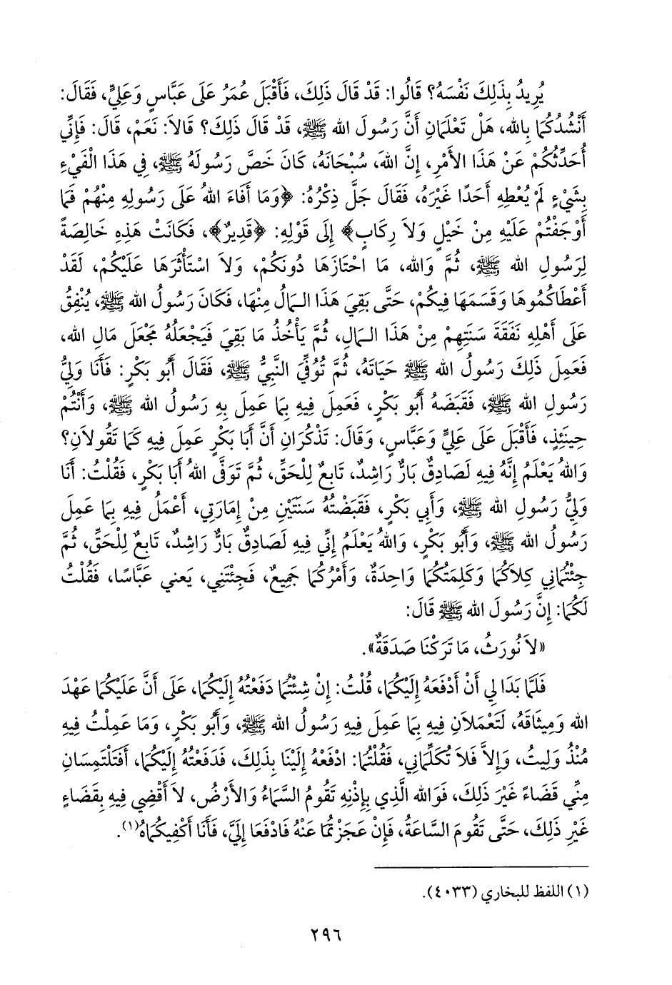 فلما بدا لي أن أدفعه إليكما، قلت: إن شئتما دفعته إليكما، على أن عليكما عهد الله وميثاقه، لتعملان فيه بما عمل فيه رسول الله صَلى الله عَليه وسَلم وأَبو بكر، وما عملت فيه منذ وليت، وإلا فلا تكلماني، فقلتما: ادفعه إلينا بذلك، فدفعته إليكما، أفتلتمسان مني قضاء غير ذلك، فوالله الذي بإذنه تقوم السماء والأرض، لا أقضي فيه بقضاء غير ذلك، حتى تقوم الساعة، فإن عجزتما عنه فادفعا إلي، فأنا أكفيكماه (¬١).