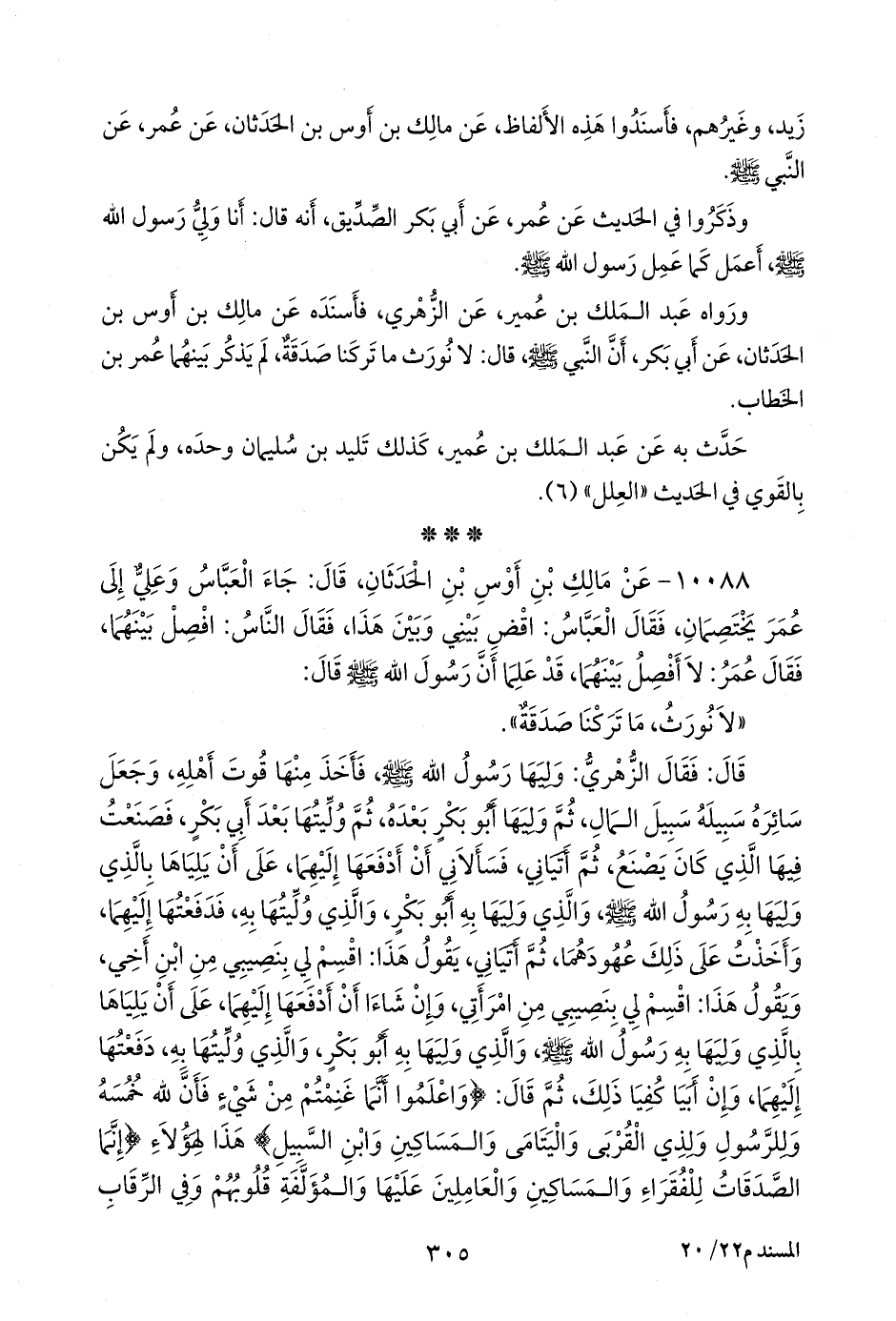 ١٠٠٨٨ - عن مالك بن أوس بن الحدثان، قال: جاء العباس وعلي إلى عمر يختصمان، فقال العباس: اقض بيني وبين هذا، فقال الناس: افصل بينهما، فقال عمر: لا أفصل بينهما، قد علما أن رسول الله صَلى الله عَليه وسَلم قال: