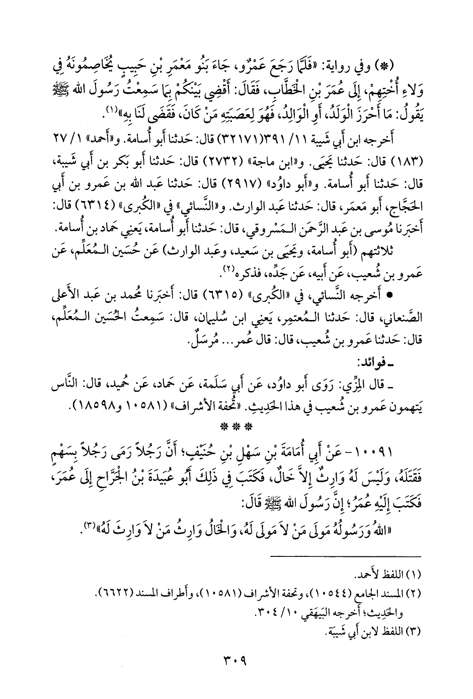 ١٠٠٩١ - عن أَبي أُمامة بن سهل بن حنيف؛ أن رجلا رمى رجلا بسهم فقتله، وليس له وارث إلا خال، فكتب في ذلك أَبو عُبَيدة بن الجَراح إلى عمر، فكتب إليه عمر؛ إن رسول الله صَلى الله عَليه وسَلم قال: