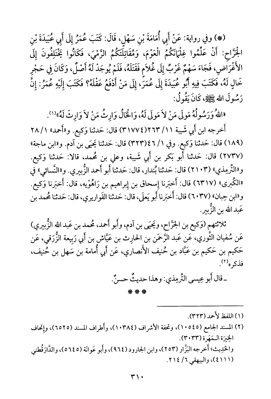 ثلاثتهم (وكيع بن الجراح، ويحيى بن آدم، وأَبو أحمد، محمد بن عبد الله الزُّبَيري) عن سفيان الثوري، عن عبد الرَّحمَن بن الحارث بن عياش بن أبي ربيعة الزرقي، عن حكيم بن حكيم بن عباد بن حنيف الأَنصاري، عن أَبي أُمامة بن سهل بن حنيف، فذكره (¬١).