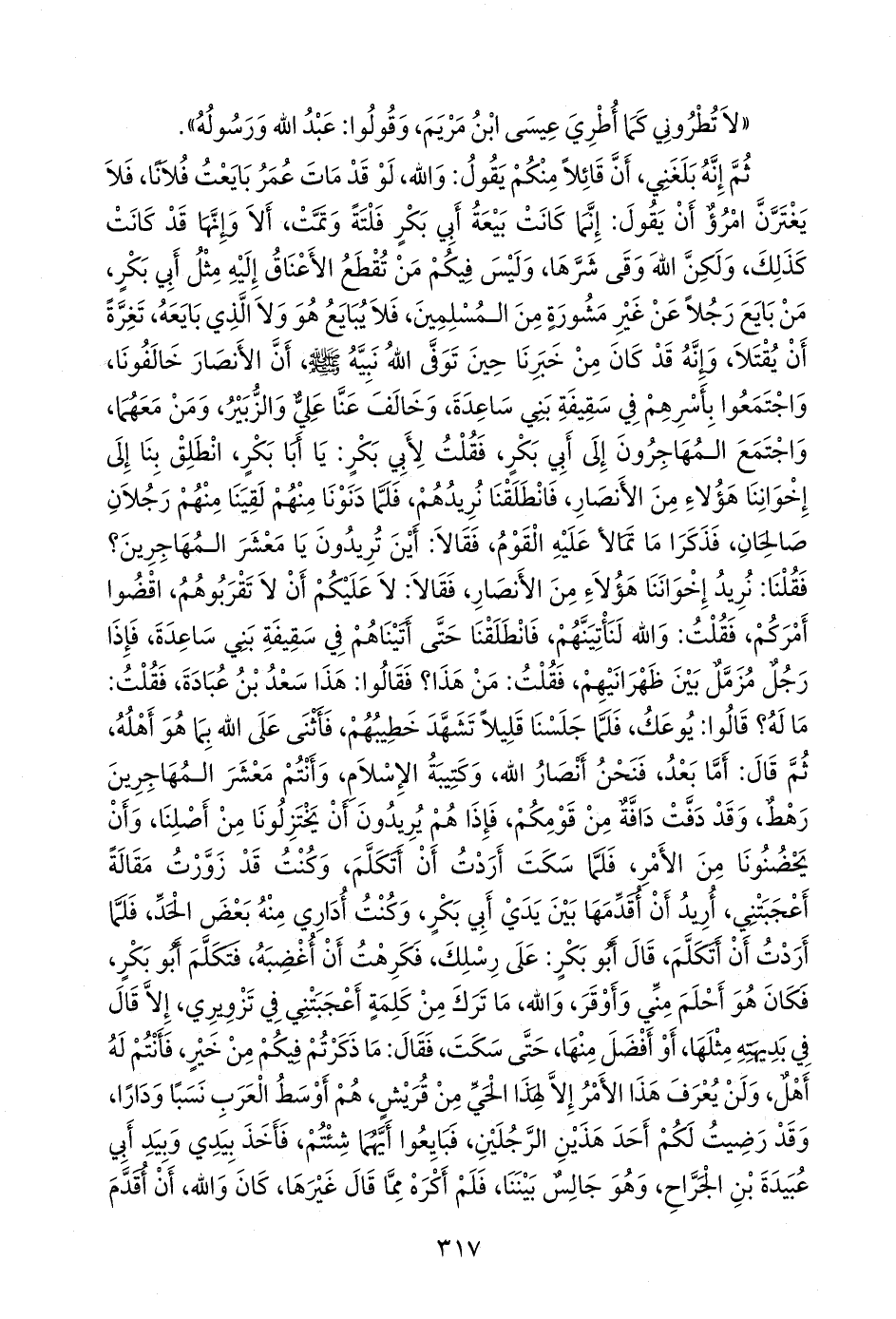 فلما أردت أن أتكلم، قال أَبو بكر: على رسلك، فكرهت أن أغضبه، فتكلم أَبو بكر، فكان هو أحلم مني وأوقر، والله، ما ترك من كلمة أعجبتني في تزويري، إلا قال في بديهته مثلها، أو أفضل منها، حتى سكت، فقال: ما ذكرتم فيكم من خير، فأنتم له أهل، ولن يعرف هذا الأمر إلا لهذا الحي من قريش، هم أوسط العرب نسبا ودارا، وقد رضيت لكم أحد هذين الرجلين، فبايعوا أيهما شئتم، فأخذ بيدي وبيد أبي عُبَيدة بن الجَراح، وهو جالس بيننا، فلم أكره مما قال غيرها، كان والله، أن أقدم