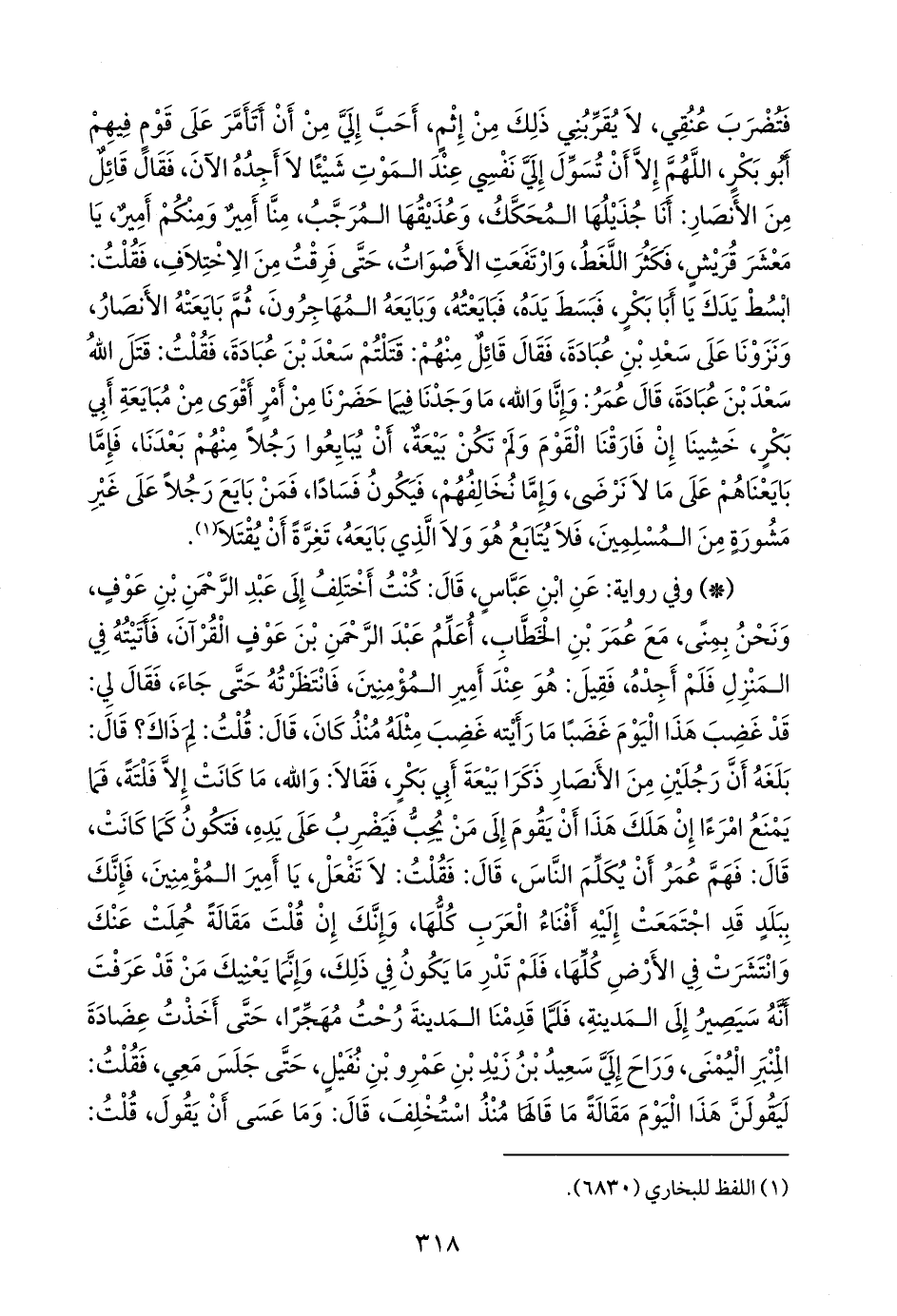 - وفي رواية: عن ابن عباس، قال: كنت أختلف إلى عبد الرَّحمَن بن عوف، ونحن بمنى، مع عمر بن الخطاب, أعلم عبد الرَّحمَن بن عوف القرآن, فأتيته في المنزل فلم أجده، فقيل: هو عند أمير المؤمنين, فانتظرته حتى جاء، فقال لي: قد غضب هذا اليوم غضبا ما رأيته غضب مثله منذ كان، قال: قلت: لم ذاك؟ قال: بلغه أن رجلين من الأنصار ذكرا بيعة أَبي بكر، فقالا: والله، ما كانت إلا فلتة, فما يمنع امرءا إن هلك هذا أن يقوم إلى من يحب فيضرب على يده، فتكون كما كانت، قال: فهم عمر أن يكلم الناس، قال: فقلت: لا تفعل، يا أمير المؤمنين, فإنك ببلد قد اجتمعت إليه أفناء العرب كلها, وإنك إن قلت مقالة حملت عنك وانتشرت في الأرض كلها, فلم تدر ما يكون في ذلك, وإنما يعنيك من قد عرفت أنه سيصير إلى المدينة، فلما قدمنا المدينة رحت مهجرا، حتى أخذت عضادة المنبر اليمنى, وراح إلي سعيد بن زيد بن عَمرو بن نفيل، حتى جلس معي, فقلت: ليقولن هذا اليوم مقالة ما قالها منذ استخلف، قال: وما عسى أن يقول, قلت:
