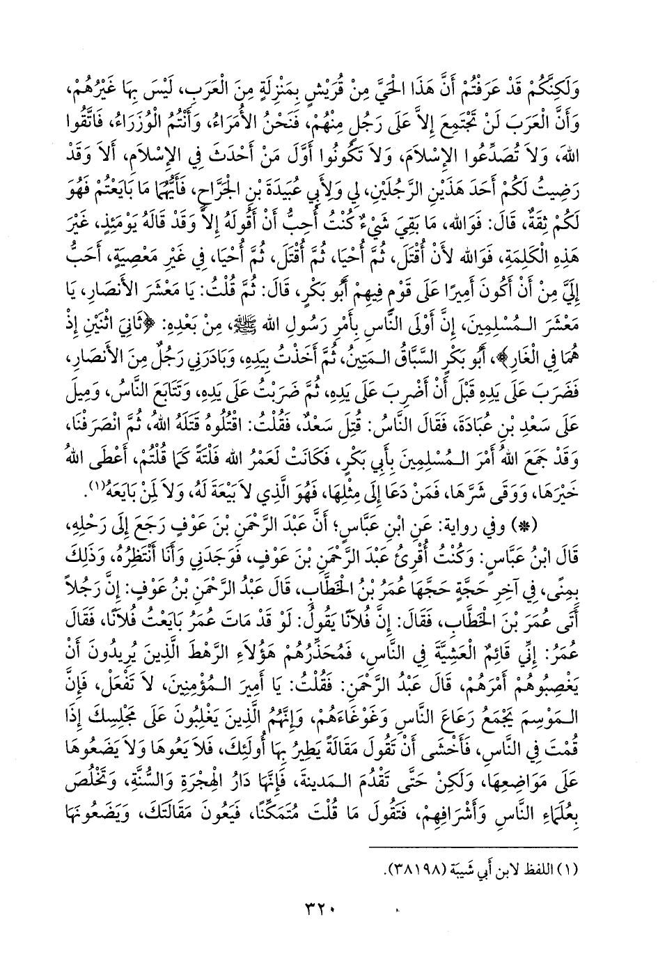 - وفي رواية: عن ابن عباس؛ أن عبد الرَّحمَن بن عوف رجع إلى رحله، قال ابن عباس: وكنت أقرئ عبد الرَّحمَن بن عوف، فوجدني وأنا أنتظره، وذلك بمنى، في آخر حجة حجها عمر بن الخطاب، قال عبد الرَّحمَن بن عوف: إن رجلا أتى عمر بن الخطاب، فقال: إن فلانا يقول: لو قد مات عمر بايعت فلانا، فقال عمر: إني قائم العشية في الناس، فمحذرهم هؤلاء الرهط الذين يريدون أن يغصبوهم أمرهم، قال عبد الرَّحمَن: فقلت: يا أمير المؤمنين، لا تفعل، فإن الموسم يجمع رعاع الناس وغوغاءهم، وإنهم الذين يغلبون على مجلسك إذا قمت في الناس، فأخشى أن تقول مقالة يطير بها أولئك، فلا يعوها ولا يضعوها على مواضعها، ولكن حتى تقدم المدينة، فإنها دار الهجرة والسنة، وتخلص بعلماء الناس وأشرافهم، فتقول ما قلت متمكنا، فيعون مقالتك، ويضعونها