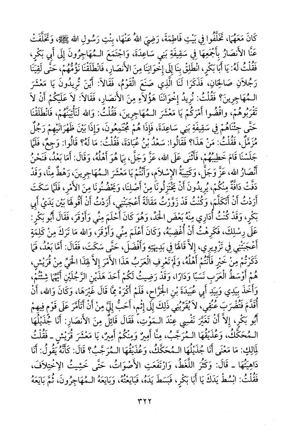 فلم أكره مما قال غيرها، وكان والله، أن أقدم فتضرب عنقي، لا يقربني ذلك إلى إثم، أحب إلي من أن أتأمر على قوم فيهم أَبو بكر، إلا أن تغير نفسي عند الموت، فقال قائل من الأنصار: أنا جذيلها المحكك، وعذيقها المرجب، منا أمير ومنكم أمير، يا معشر قريش ـ فقلت لمالك: ما معنى أنا جذيلها المحكك، وعذيقها المرجب؟ قال: كأنه يقول: أنا داهيتها ـ قال: وكثر اللغط، وارتفعت الأصوات، حتى خشيت الاختلاف، فقلت: ابسط يدك يا أبا بكر، فبسط يده، فبايعته، وبايعه المهاجرون، ثم بايعه