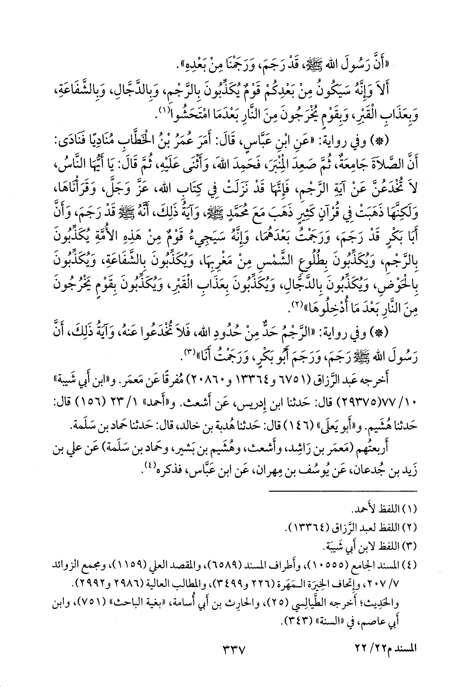 - وفي رواية: «الرجم حد من حدود الله, فلا تخدعوا عنه, وآية ذلك، أن رسول الله صَلى الله عَليه وسَلم رجم, ورجم أَبو بكر, ورجمت أنا» (¬١).