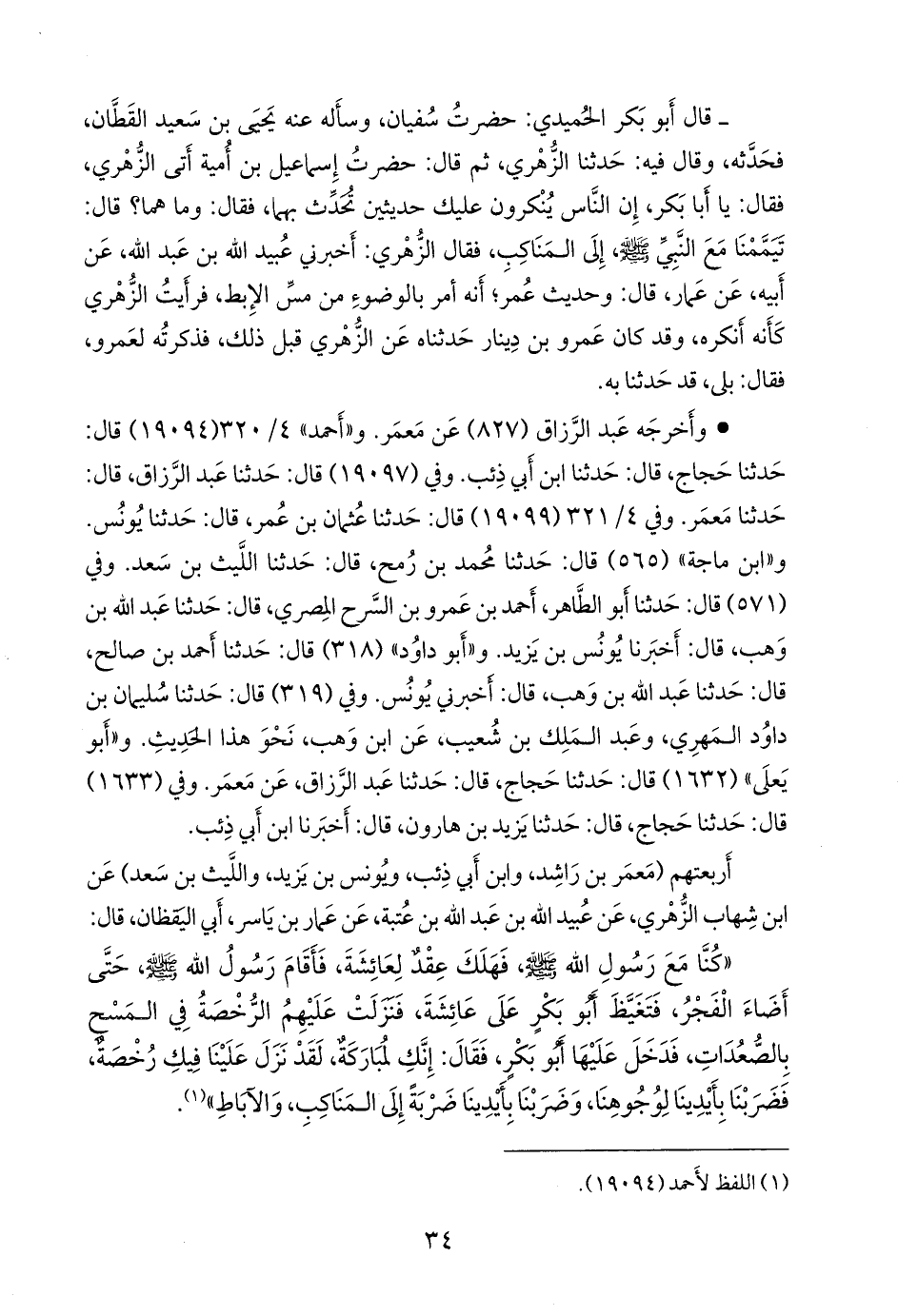 - وفي رواية: «عن عمار بن ياسر، أَنه كان يحدث، أَنهم تمسحوا، وهم مع رسول الله صَلى الله عَليه وسَلم بالصعيد لصلاة الفجر، فضربوا بأَكفهم الصعيد، ثم مسحوا وجوههم مسحة واحدة، ثم عادوا فضربوا بأَكفهم الصعيد مرة أُخرى، فمسحوا بأَيديهم كلها إِلى المناكب والآباط، من بطون أَيديهم» (¬٣).