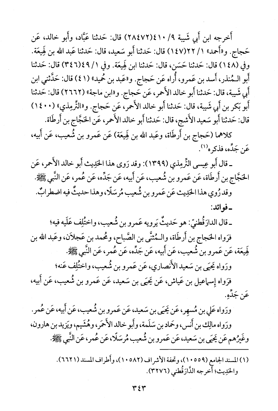 وفي (١٤٨) قال: حدثنا حسن، قال: حدثنا ابن لَهِيعة. وفي ١/ ٤٩ (٣٤٦) قال: حدثنا أَبو المنذر، أسد بن عَمرو، أراه عن حجاج. و «عَبد بن حُميد» (٤١) قال: حدثني ابن أبي شيبة، قال: حدثنا أَبو خالد الأحمر، عن حجاج. و «ابن ماجة» (٢٦٦٢) قال: حدثنا أَبو بكر بن أبي شيبة، قال: حدثنا أَبو خالد الأحمر، عن حجاج. و «التِّرمِذي» (١٤٠٠) قال: حدثنا أَبو سعيد الأشج، قال: حدثنا أَبو خالد الأحمر، عن الحجاج بن أَرطَاة.