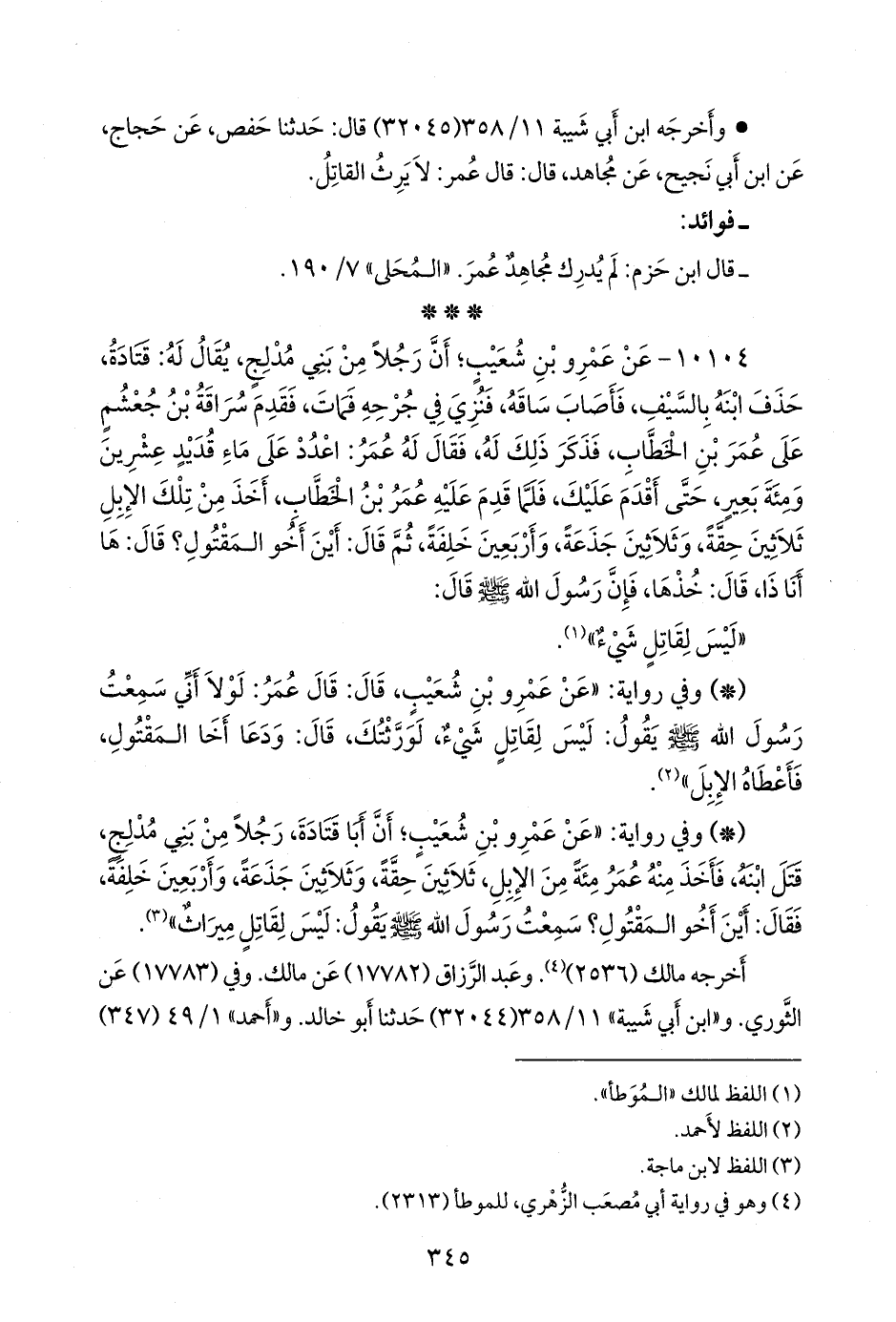 - وفي رواية: «عن عَمرو بن شعيب؛ أن أبا قتادة، رجلا من بني مدلج، قتل ابنه، فأخذ منه عمر مئة من الإبل، ثلاثين حقة، وثلاثين جذعة، وأربعين خلفة، فقال: أين أخو المقتول؟ سمعت رسول الله صَلى الله عَليه وسَلم يقول: ليس لقاتل ميراث» (¬٣).