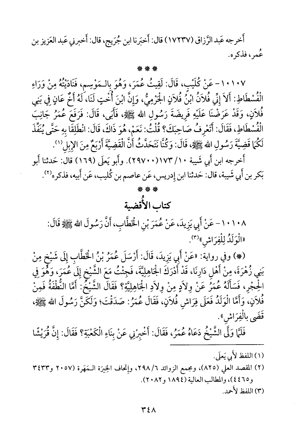 - وفي رواية: «عن أبي يزيد، قال: أرسل عمر بن الخطاب إلى شيخ من بني زُهرَة، من أهل دارنا، قد أدرك الجاهلية، فجئت مع الشيخ إلى عمر، وهو في الحجر، فسأله عمر عن ولاد من ولاد الجاهلية؟ فقال الشيخ: أما النطفة فمن فلان، وأما الولد فعلى فراش فلان، فقال عمر: صدقت؛ ولكن رسول الله صَلى الله عَليه وسَلم قضى بالفراش».