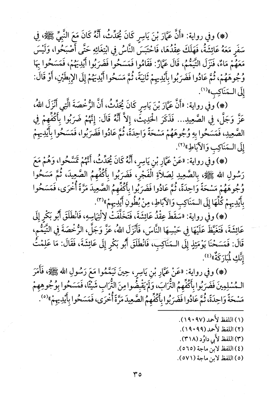 - وفي رواية: «عن عمار بن ياسر، حين تيمموا مع رسول الله صَلى الله عَليه وسَلم قال: فأَمر المسلمين فضربوا بأَكفهم التراب، ولم يقبضوا من التراب شيئا، فمسحوا بوجوههم مسحة واحدة، ثم عادوا فضربوا بأَكفهم الصعيد مرة أُخرى، فمسحوا بأَيديهم» (¬١).