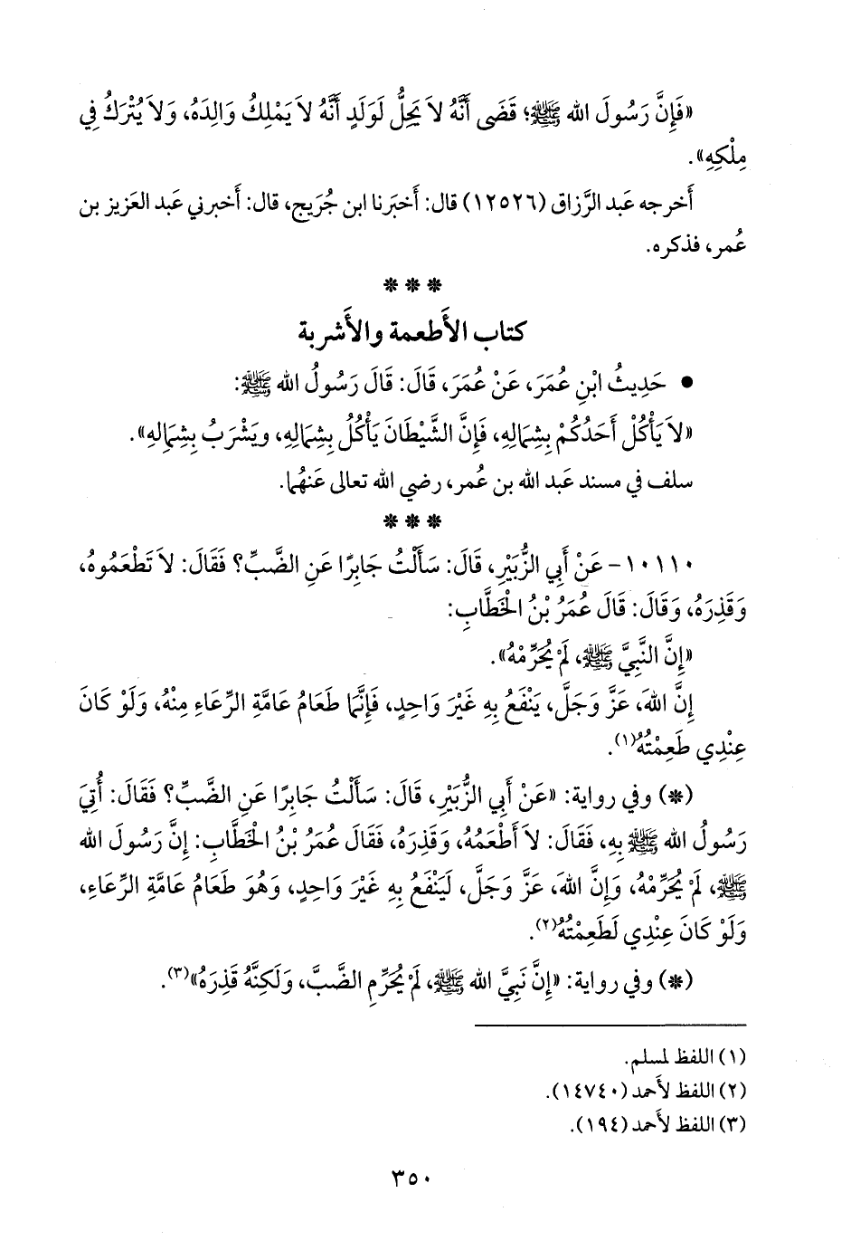 ١٠١١٠ - عن أبي الزبير، قال: سألت جابرا عن الضب؟ فقال: لا تطعموه، وقذره، وقال: قال عمر بن الخطاب: