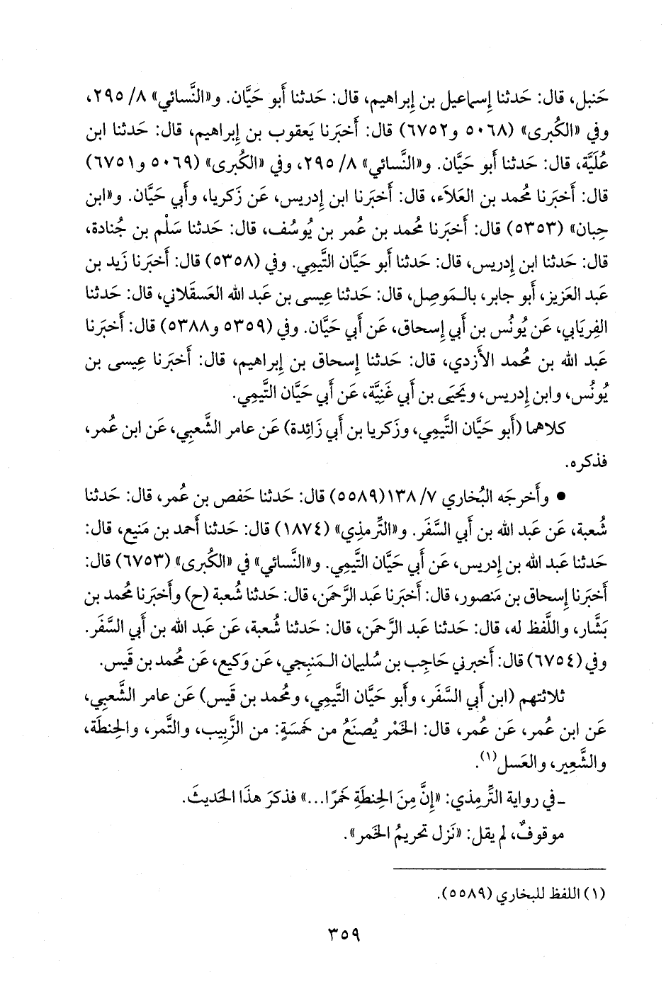 ثلاثتهم (ابن أبي السفر، وأَبو حيان التيمي، ومحمد بن قيس) عن عامر الشعبي، عن ابن عمر، عن عمر، قال: الخمر يصنع من خمسة: من الزبيب، والتمر، والحنطة، والشعير، والعسل (¬١).