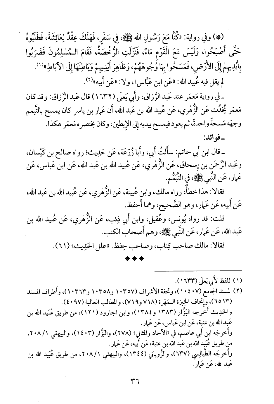 قلت: قد رواه يونس، وعُقيل، وابن أَبي ذِئب، عن الزهري، عن عُبيد الله بن عبد الله، عن عمار، عن النبي صَلى الله عَليه وسَلم وهم أَصحاب الكتب.