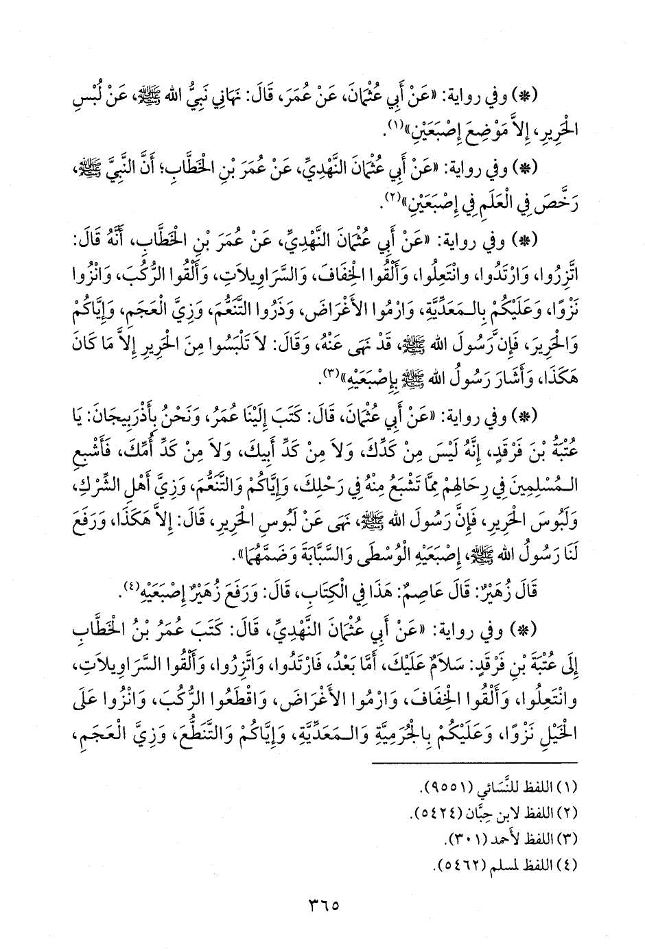 - وفي رواية: «عن أبي عثمان، قال: كتب إلينا عمر، ونحن بأذربيجان: يا عتبة بن فرقد، إنه ليس من كدك، ولا من كد أبيك، ولا من كد أمك، فأشبع المسلمين في رحالهم مما تشبع منه في رحلك، وإياكم والتنعم، وزي أهل الشرك، ولبوس الحرير، فإن رسول الله صَلى الله عَليه وسَلم نهى عن لبوس الحرير، قال: إلا هكذا، ورفع لنا رسول الله صَلى الله عَليه وسَلم إصبعيه الوسطى والسبابة وضمهما».