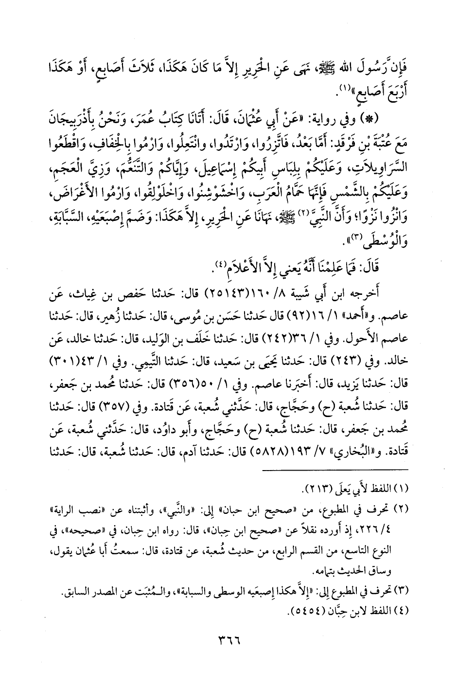 (¬١) في طبعَتي الرسالة والتأصيل لـ «صحيح ابن حِبان»، و «التقاسيم والأنواع» (٥٦٣٦) وهو أصل «صحيح ابن حِبان»: «والنبي صَلى الله عَليه وسَلم نهانا عن الحرير، إِلا هكذا إِصبعيه والوسطى والسبابة» والخلل ظاهرٌ في سياقه، وأثبتناه عن «نصب الراية» ٤/ ٢٢٦، إذ ورد نقلًا عن «صحيح ابن حبان»، قال مؤلفه: رواه ابن حِبان في «صحيحه» في النوع التاسع، من القسم الرابع، من حديث شعبة، عن قتادة، قال: سمعتُ أبا عثمان يقول، وساق الحديث بتمامه، وأخرجه البيهقي في «شُعب الإيمان» (٥٧٧٦) من طريق شعبة، وفيه: «فإن النبي صَلى الله عَليه وسَلم نهى عن الحرير إلا هكذا, وأشار شعبة بإِصبعيه الوسطى والسبابة».