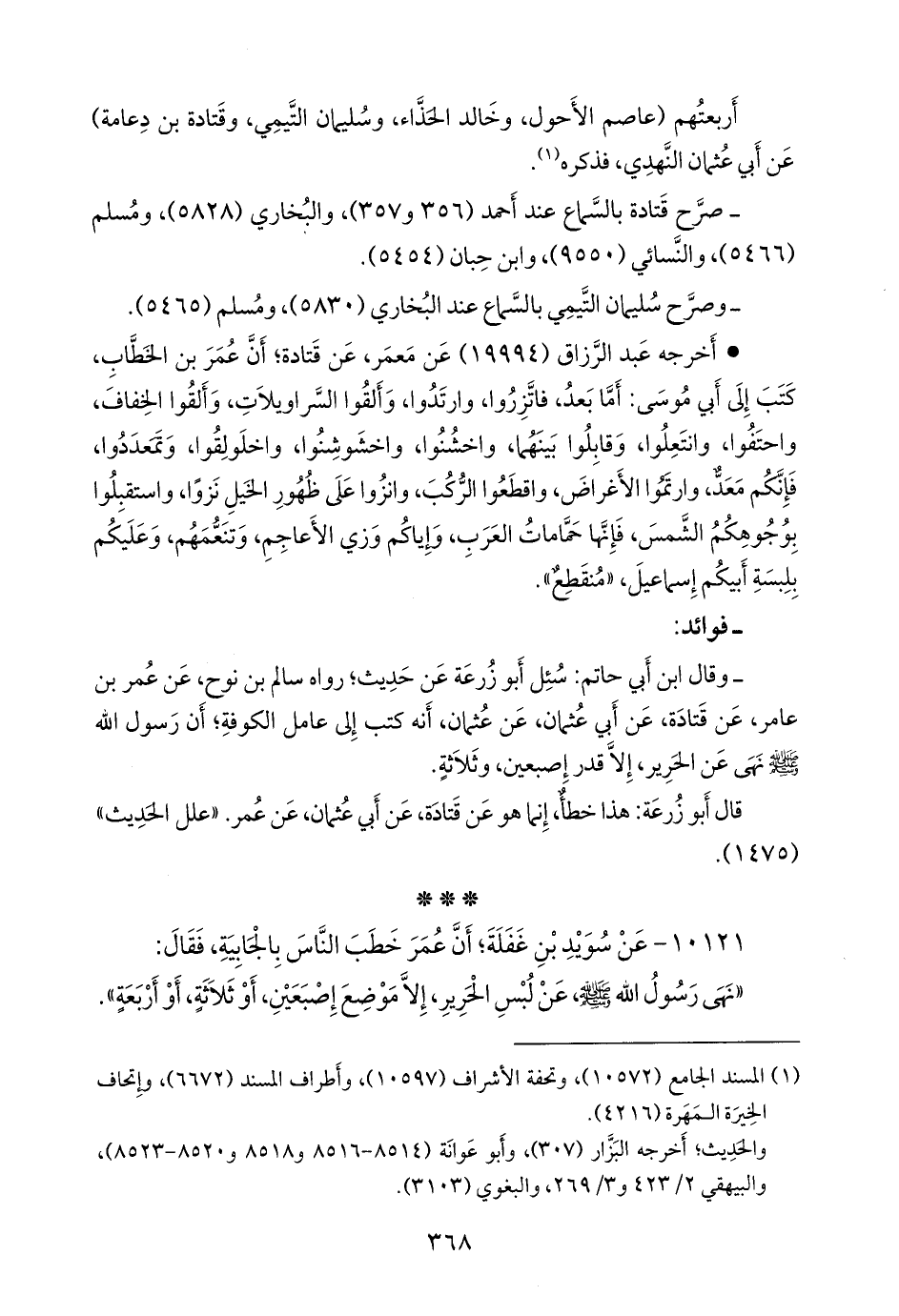 - قال ابن أبي حاتم: سئل أَبو زُرعَة عن حديث؛ رواه سالم بن نوح، عن عمر بن عامر، عن قتادة، عن أبي عثمان، عن عثمان، أنه كتب إلى عامل الكوفة؛ أن رسول الله صَلى الله عَليه وسَلم نهى عن الحرير، إلا قدر إصبعين، وثلاثة.