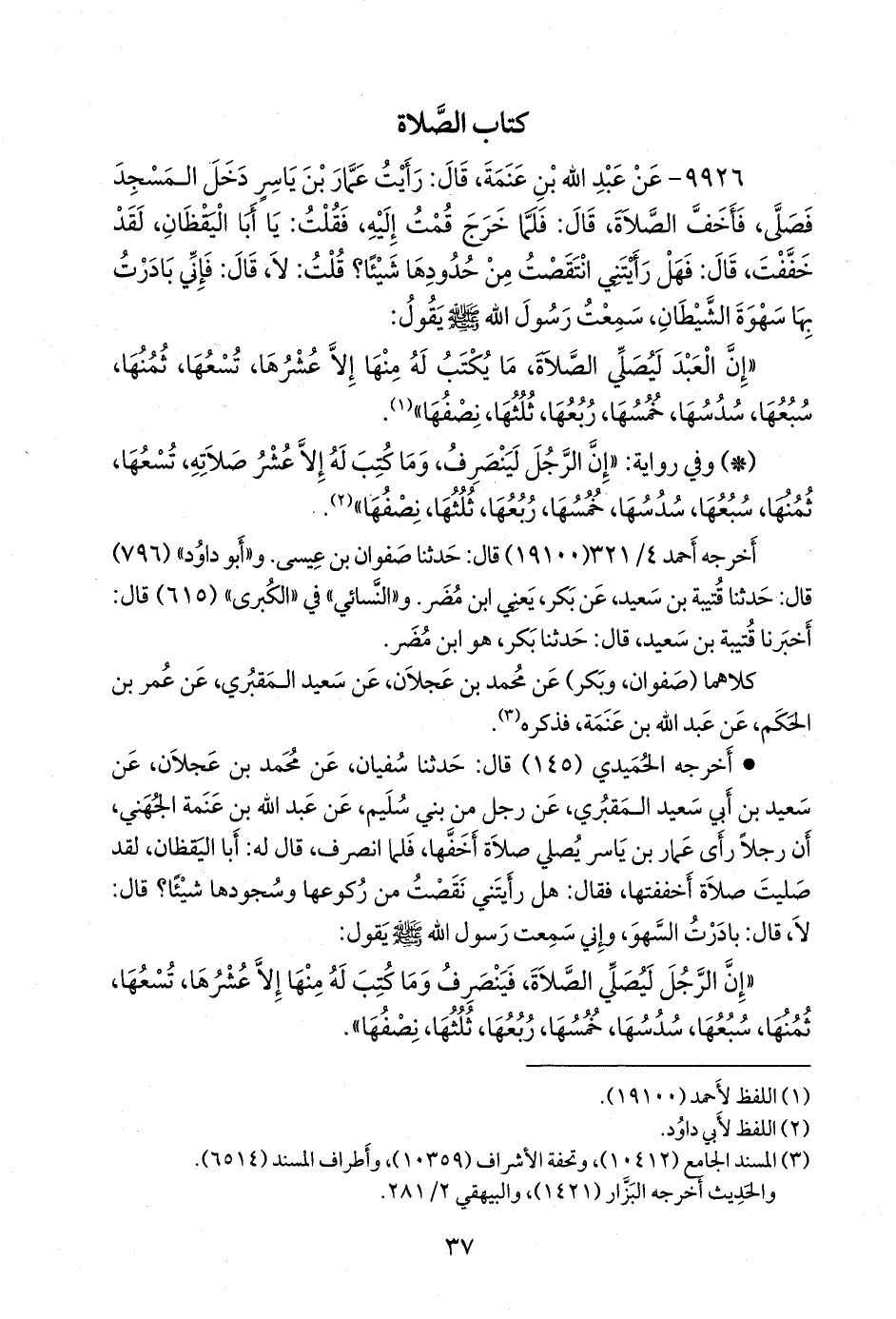 - وفي رواية: «إن الرجل لينصرف، وما كتب له إلا عشر صلاته، تسعها، ثمنها، سبعها، سدسها، خمسها، ربعها، ثلثها، نصفها» (¬٢).